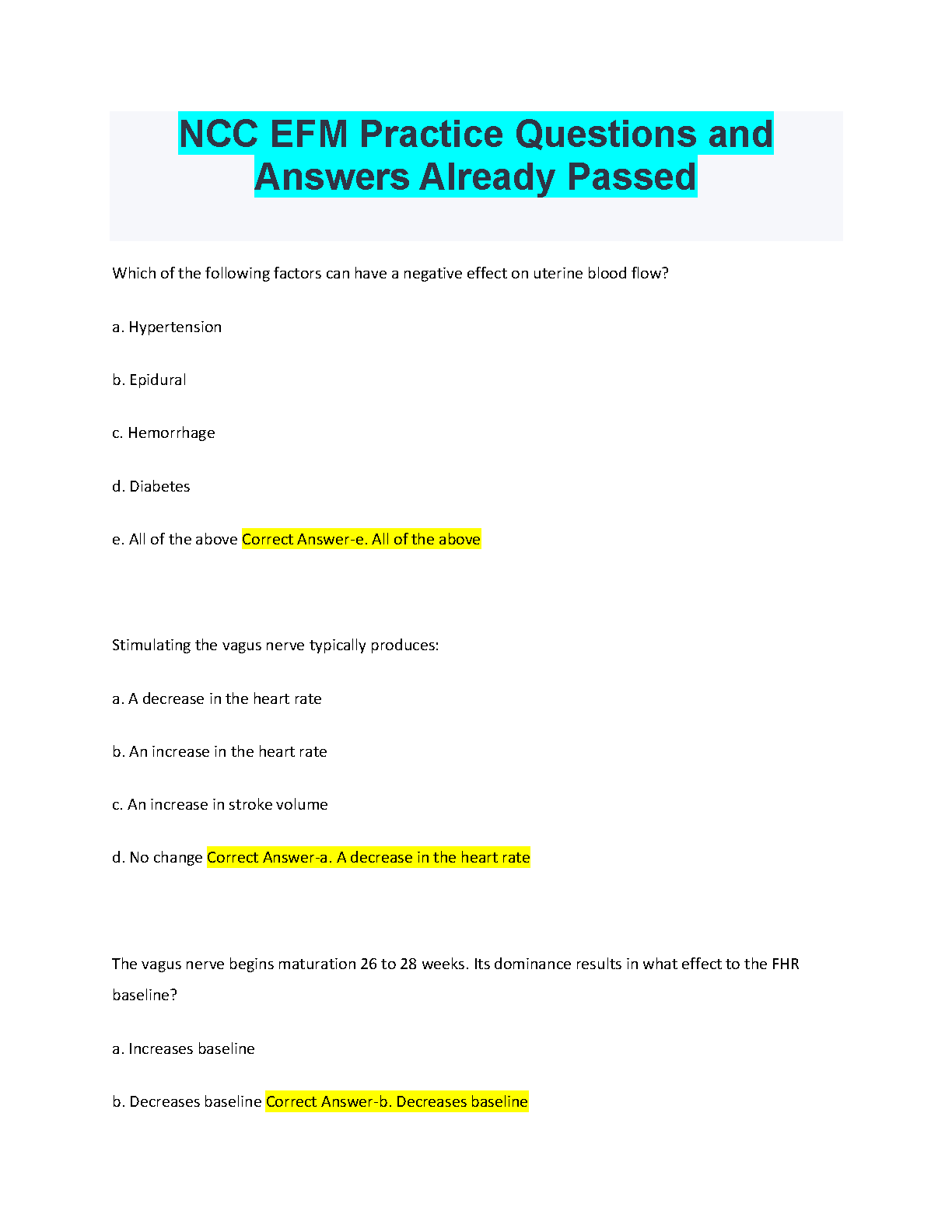 This comprehensive resource provides practice questions and answers covering key concepts related to Electronic Fetal Monitoring (EFM). Designed to help you ace your exam on the first attempt and avoid resits, this resource is perfect for students preparing for their EFM certification or those seeking to enhance their knowledge.