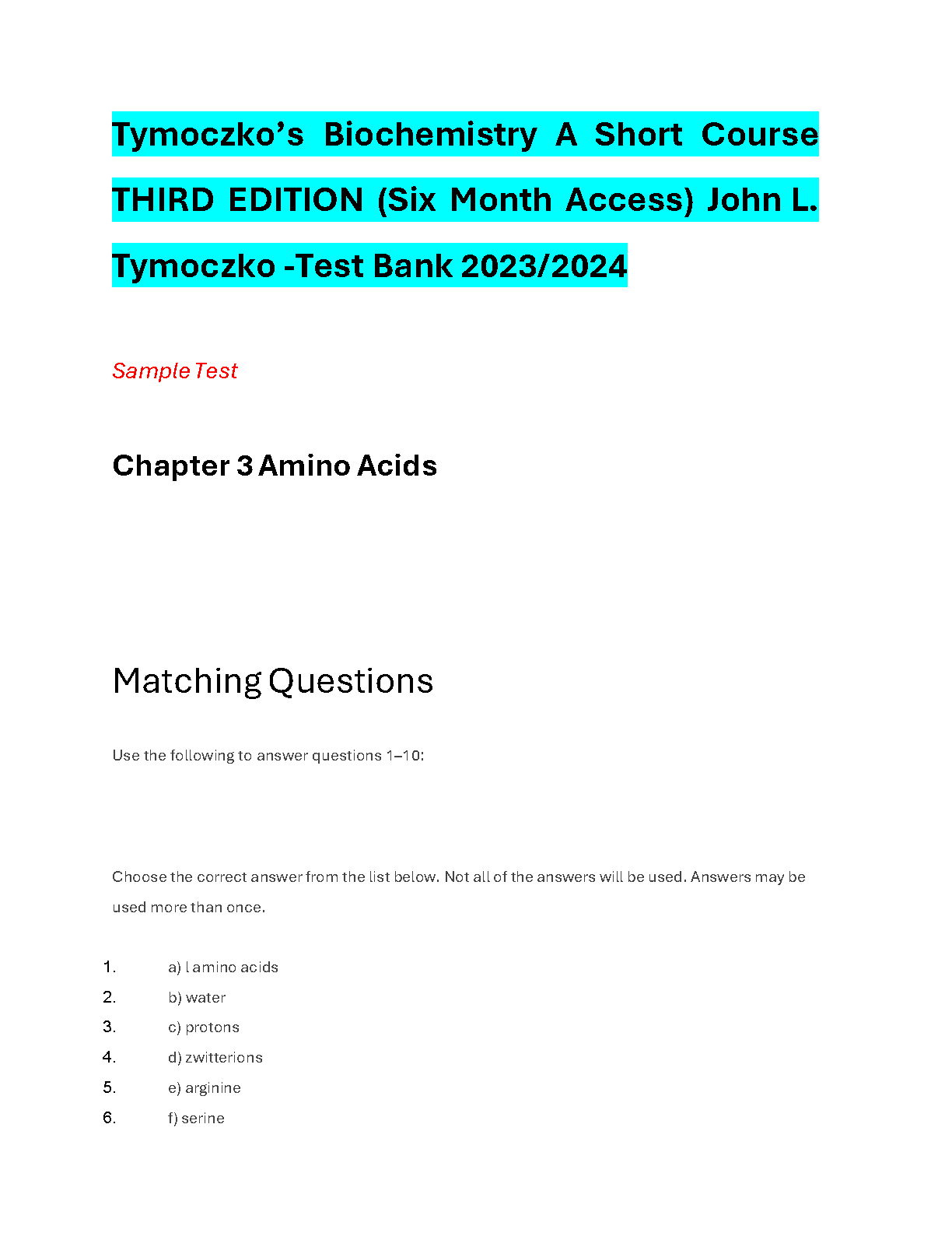 Tymochko, John L. and John L. Tymoczko - Biochemistry: A Short Course, Third Edition Test Bank 2023/2024