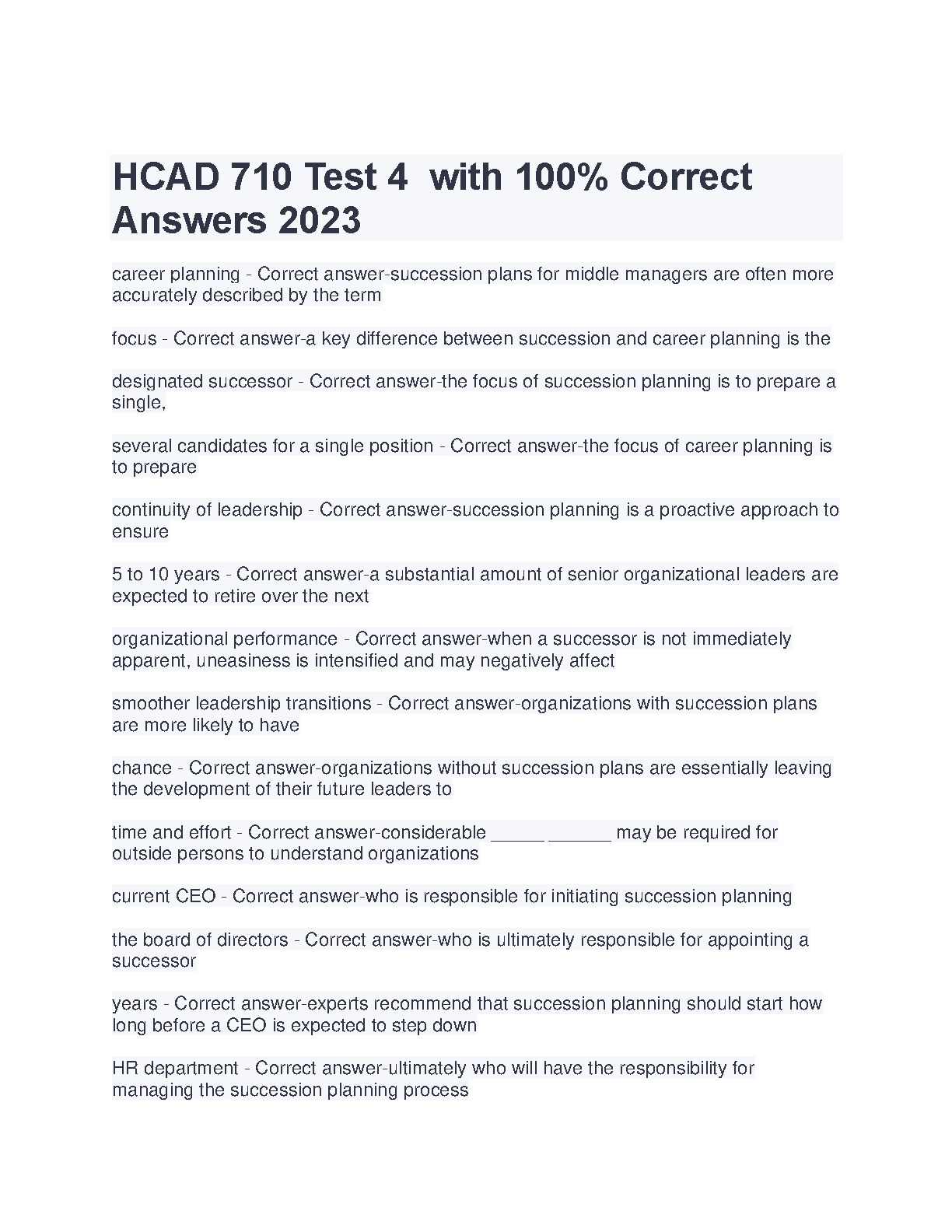 This HCAD 710 Test 4 with 100% Correct Answers 2023 Edition study guide provides comprehensive coverage of all key concepts and topics, ensuring you succeed in your exam on the first attempt and avoid any resits. It offers detailed explanations, practice questions, and real-world scenarios, helping you master the material thoroughly.
