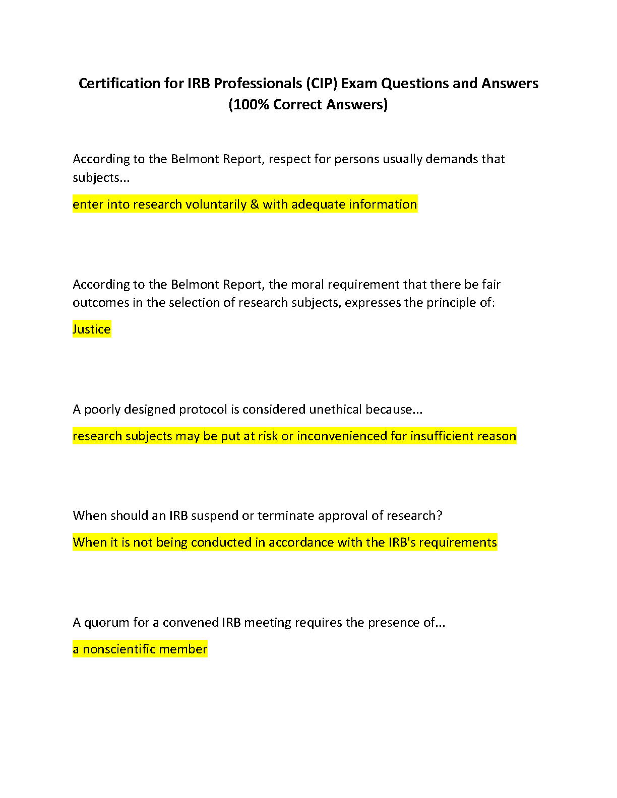 Ace your Certification for IRB Professionals (CIP) exam on the first attempt with our comprehensive study guide. This resource includes 100% correct answers to practice questions, helping you confidently pass your exam and avoid resits.