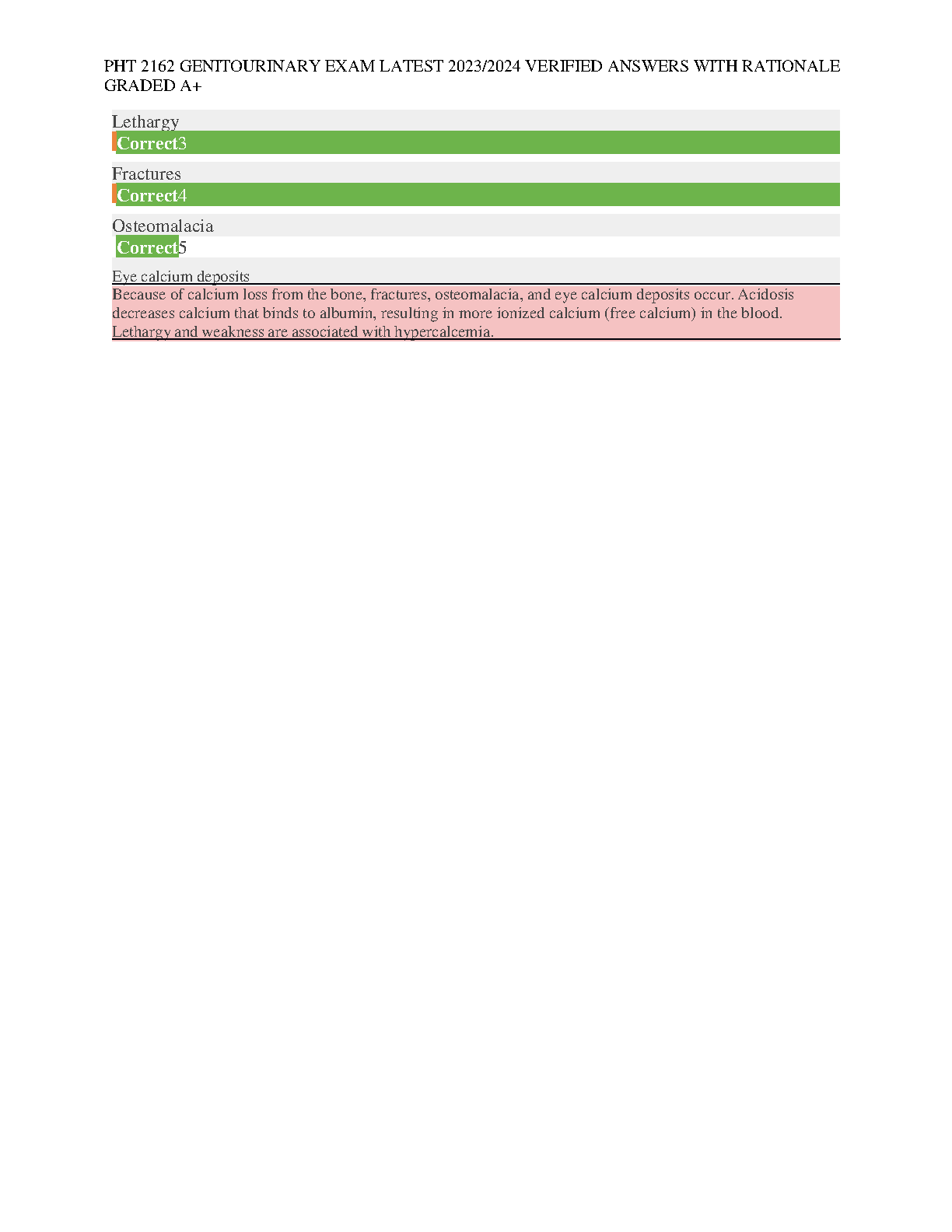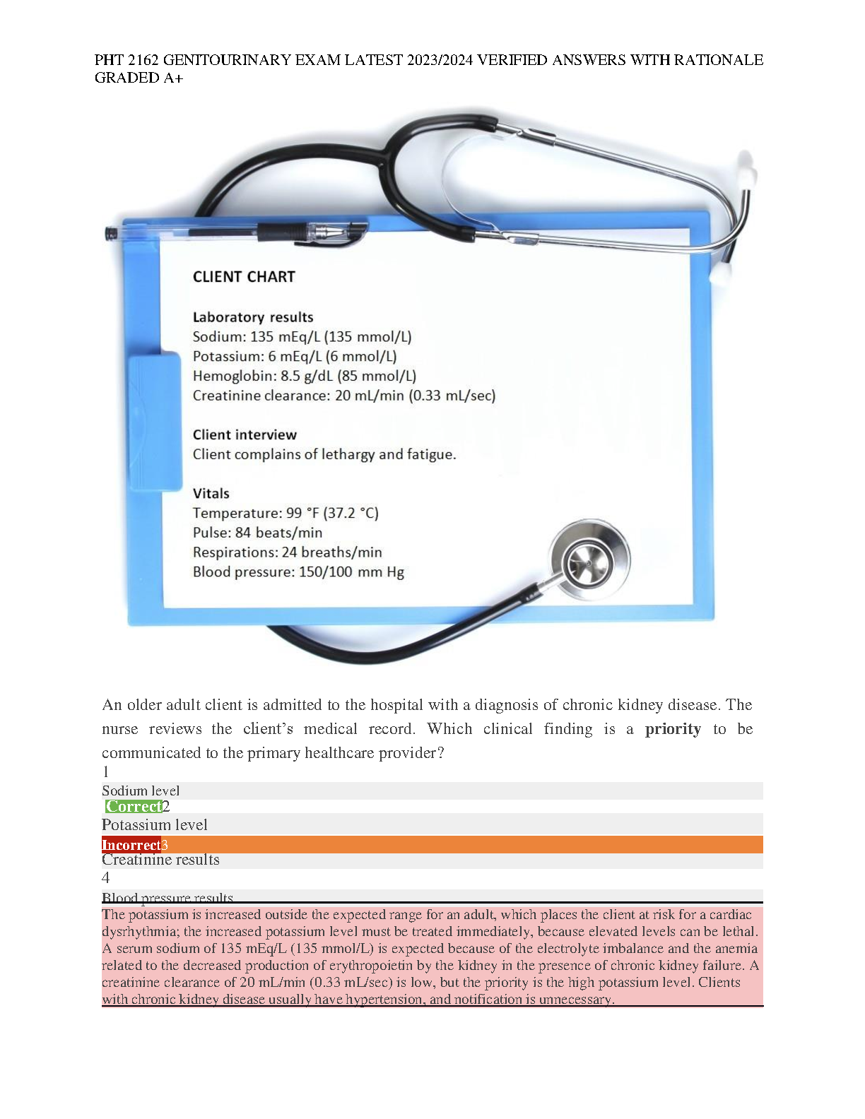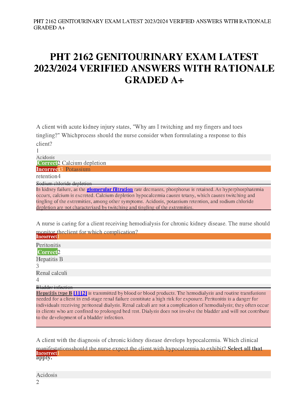 Ace your PHT 2162 Genitourinary exam with this latest 2023/2024 edition of verified answers and rationales. These solutions are graded A+ and are meticulously curated to ensure you pass on the first attempt.