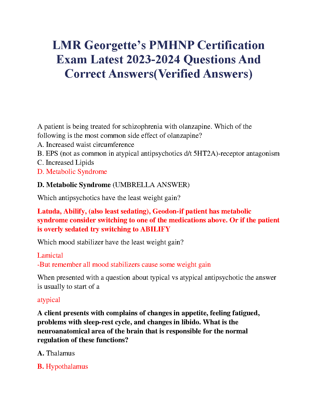 LMR Georgette's PMHNP Certification Exam Latest 2023-2024 Questions and Correct Answers (Verified Answers)