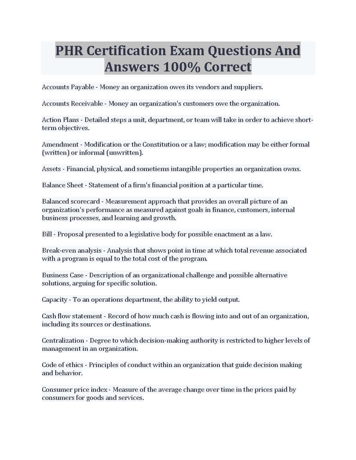 PHR Certification Exam Questions And Answers 100% Correct
