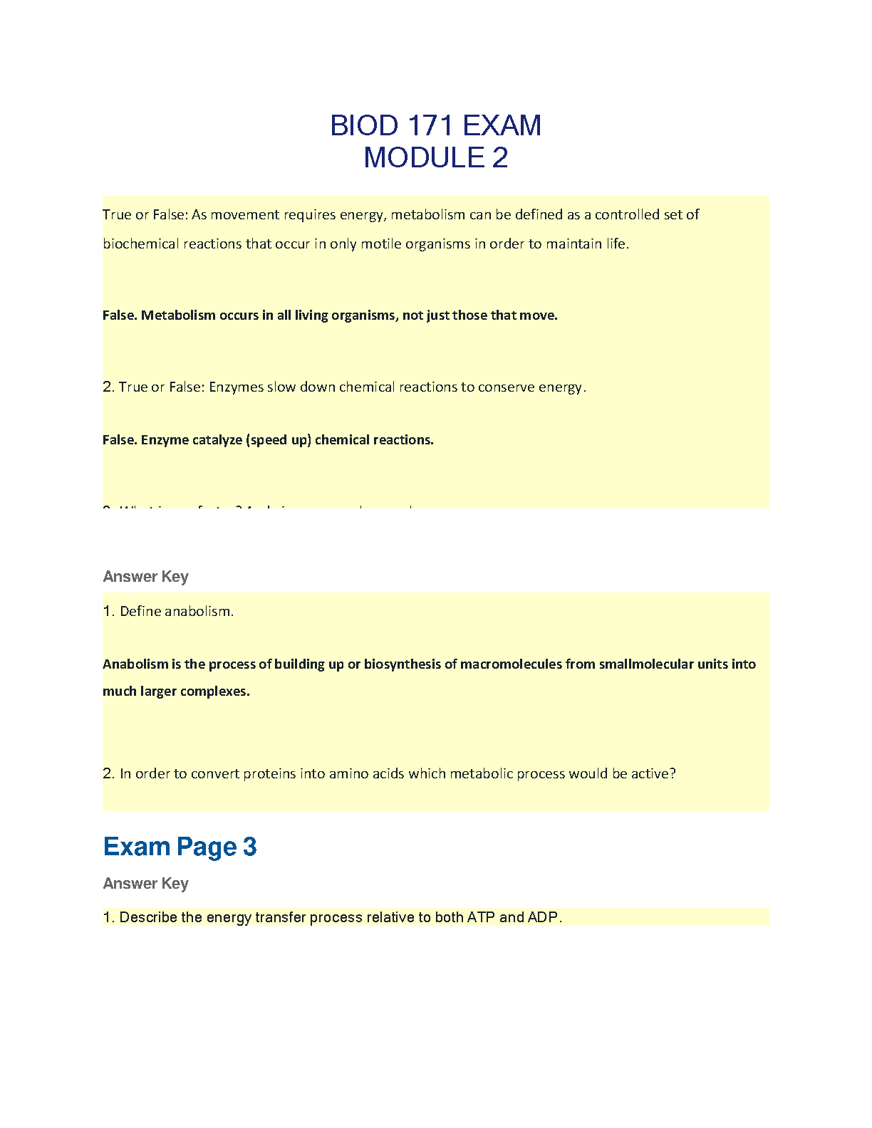 This BIOD 171 Exam Module 2 Answer Key covers basic definitions of anabolism, metabolism, and catabolism in relation to energy transfer.