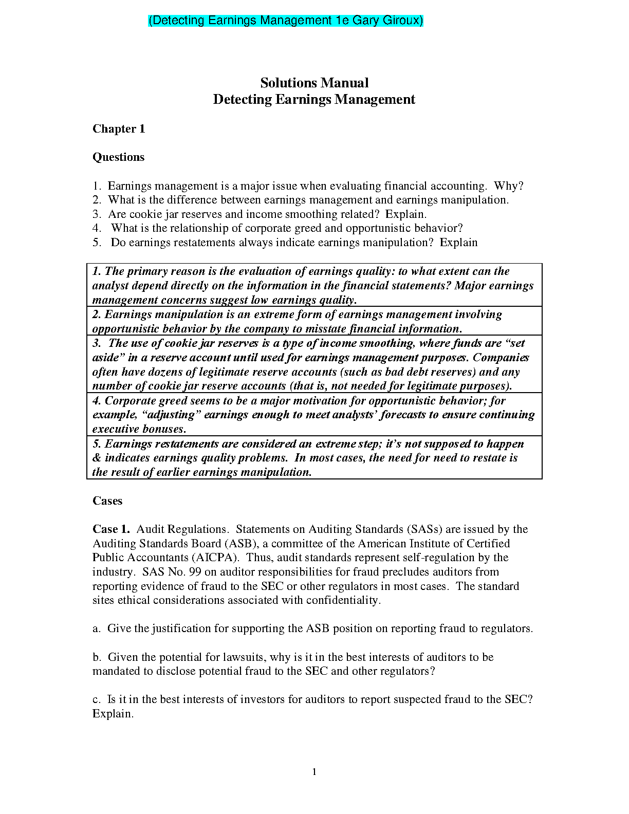 Detecting Earnings Management Solutions Manual, 1st Edition, by Gary Giroux