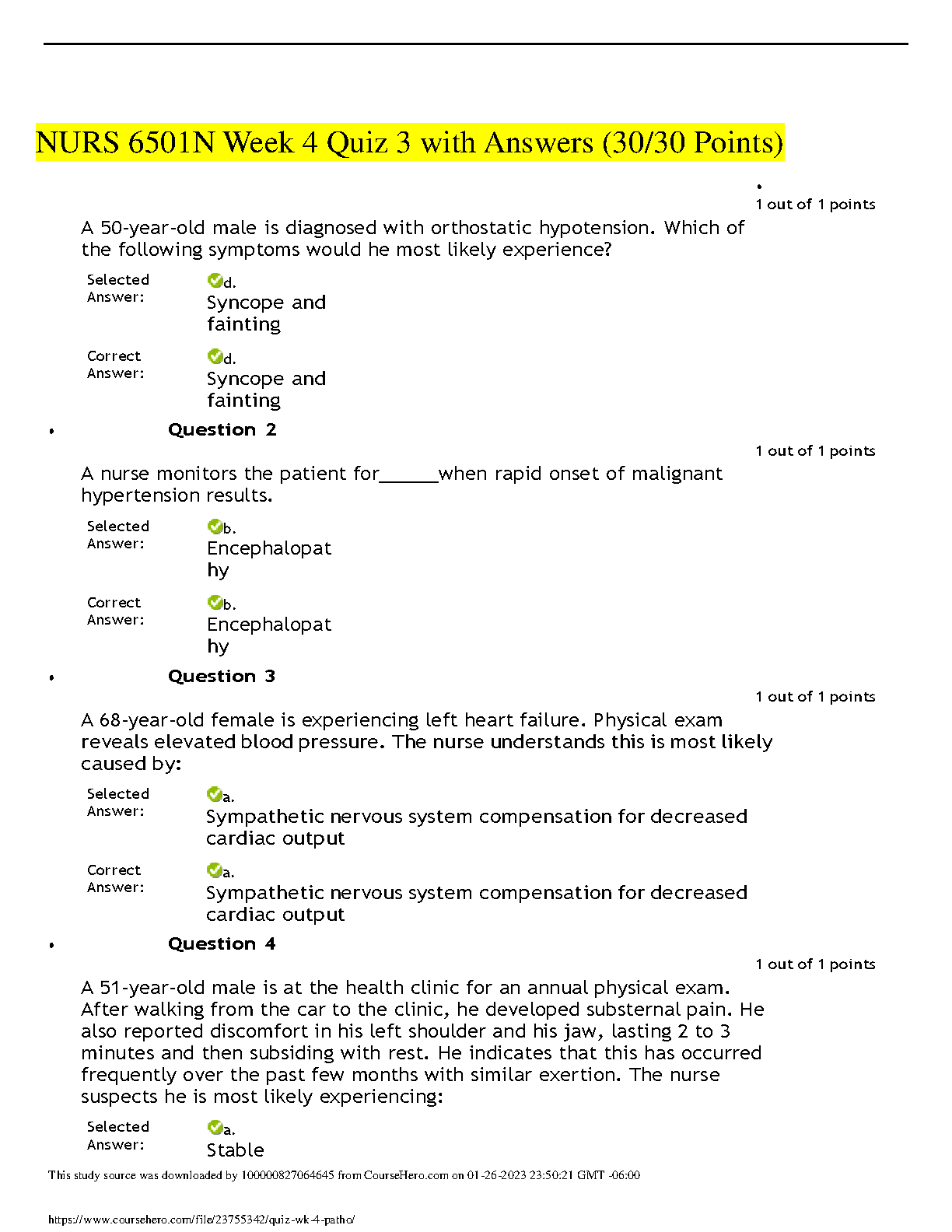 This is a comprehensive set of answers to the NURS 6501N Week 4 Quiz 3 with a total of 30 points. This resource is designed to help students achieve success on their first attempt, avoiding resits and ensuring mastery of the course material.