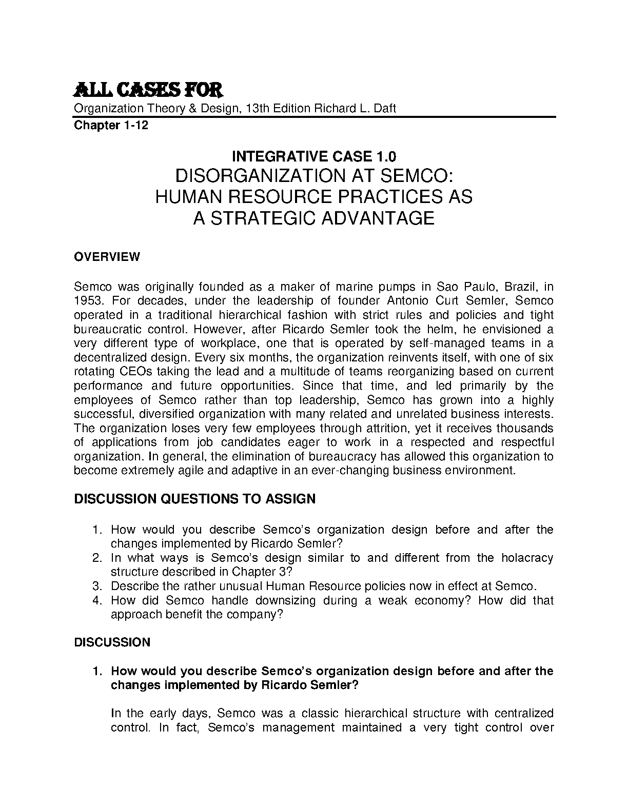 Organization Theory & Design, 13th Edition by Richard L. Daft: Integrative Case 1.0 - Disorganization at Semco: Human Resource Practices as a Strategic Advantage