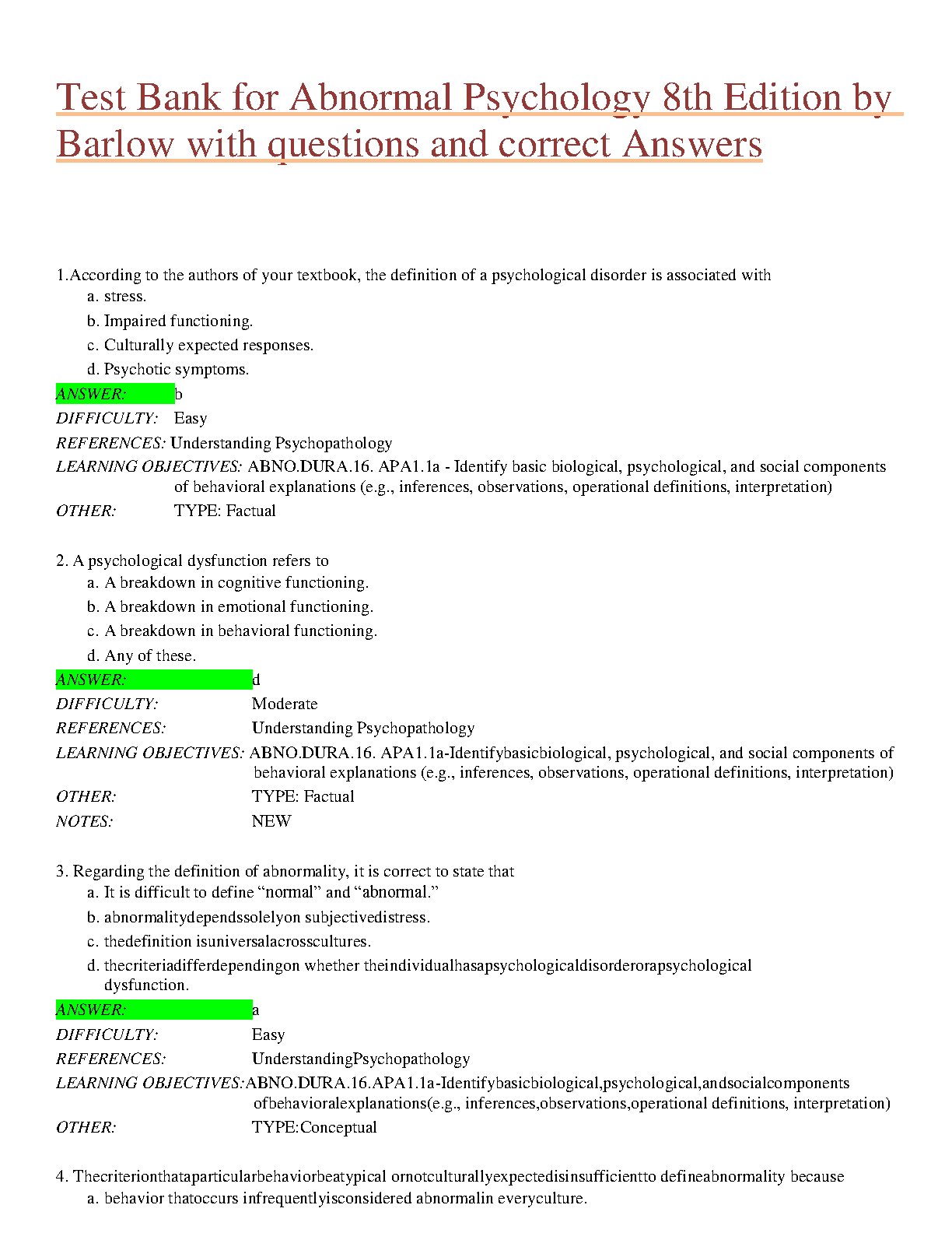 Prepare for your Abnormal Psychology course with this comprehensive test bank. This resource provides a wide range of multiple-choice questions, true/false statements, and short-answer questions covering all key topics of Abnormal Psychology, 8th Edition by David Barlow, V Mark Durand, and Stefan Hofmann.