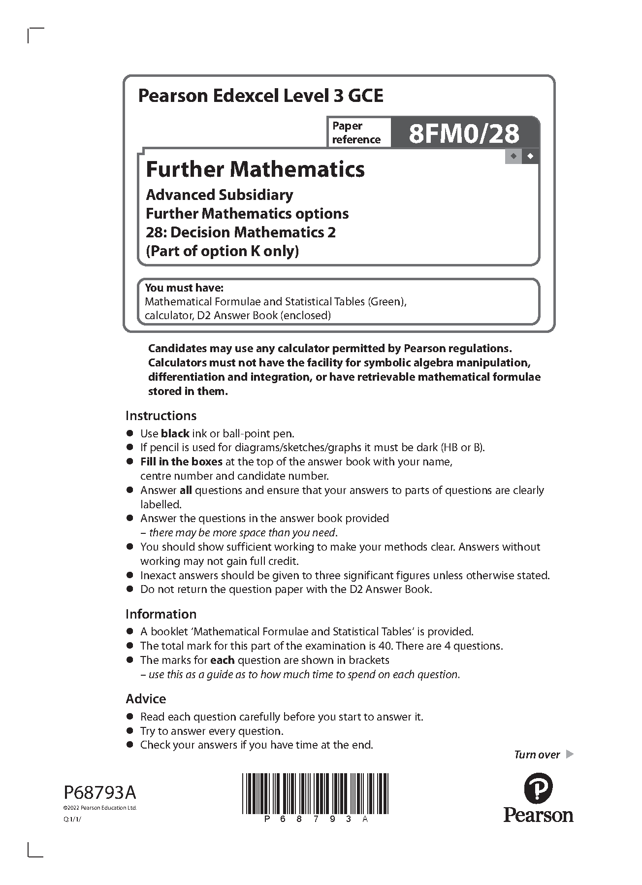 Pearson Edexcel Level 3 GCE Further Mathematics 8FM0/28 (Part of option K only) - Decision Mathematics 2 - 2024/2025 Edition by Michael Clapham, David Martin, Keith Pledger, Robert Tarling, Richard Worthington, John Berry