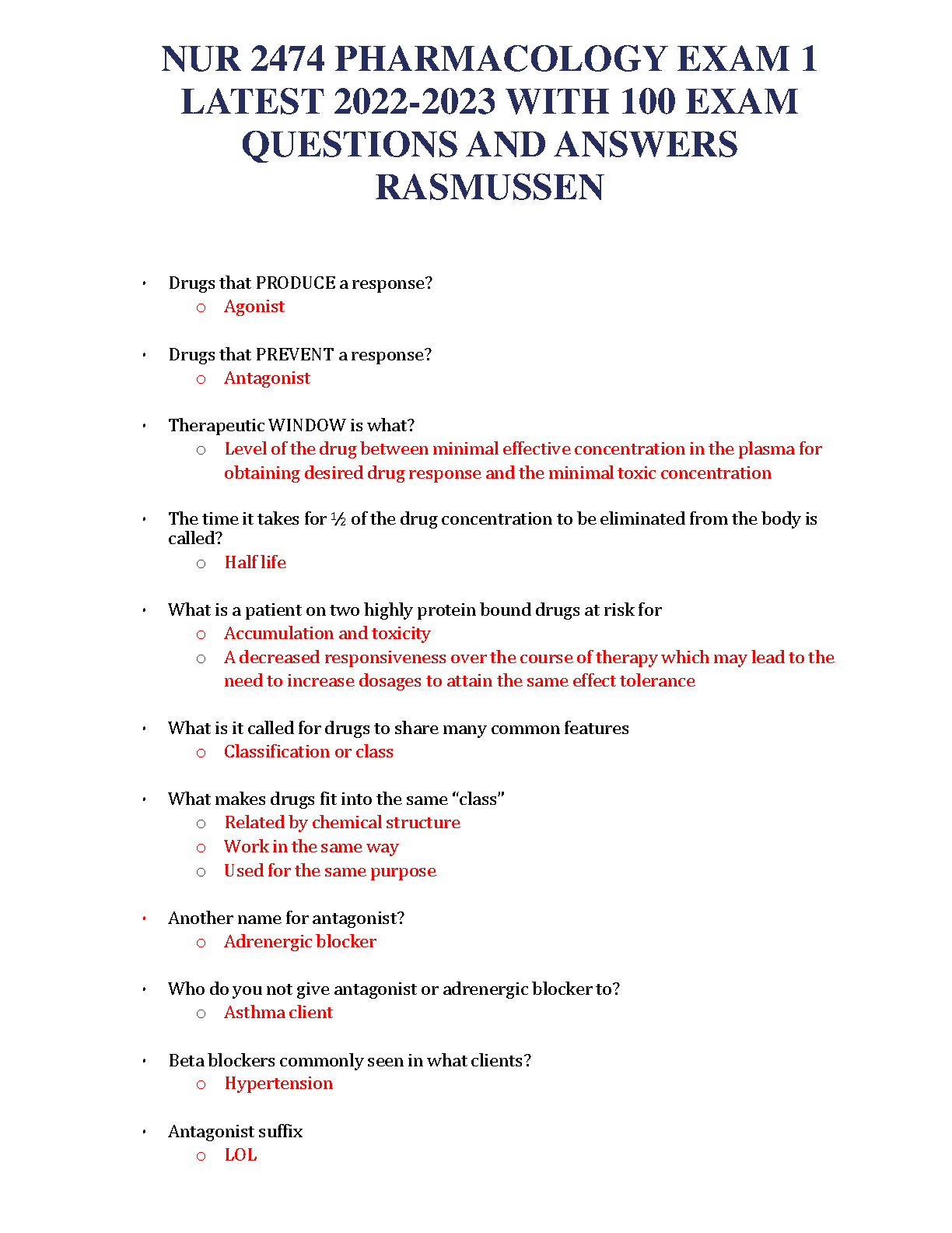 NUR 2474 Pharmacology Exam 1 Latest 2022-2023 with 100 Exam Questions and Answers by Rasmussen