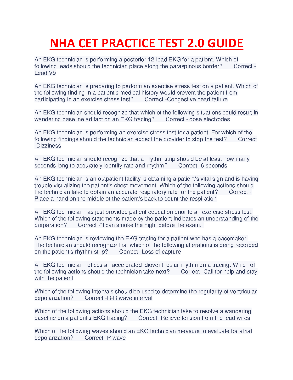 This comprehensive study guide for the NHA CET Practice Test 2.0 provides everything you need to know to pass the exam on your first attempt and become a certified EKG technician. The guide covers essential topics such as lead placement, rhythm interpretation, artifact identification, and patient care, all presented in a clear and concise manner. With practice questions and detailed explanations, this guide is an invaluable resource for anyone preparing for the NHA CET exam.