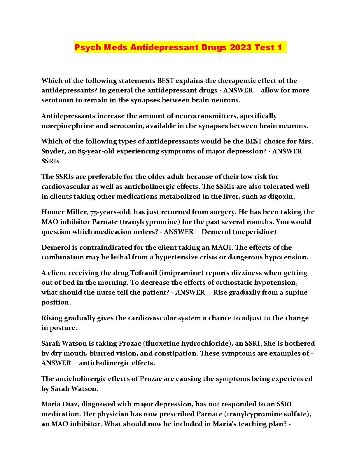 This comprehensive study guide covers all the key concepts and practice questions on Psych Meds Antidepressant Drugs. With detailed explanations and real-world examples, this resource is perfect for students who want to ace their exams on the first attempt and avoid resits. Get ready to master Psych Meds Antidepressant Drugs and achieve your academic goals!