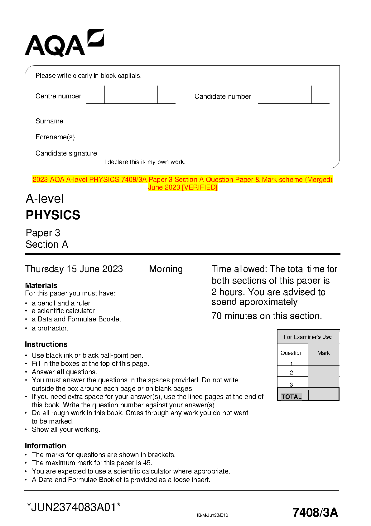 AQA A-Level Physics 7408/3A Paper 3 Section A Question Paper & Mark Scheme (Merged) June 2023 by AQA Exam Board
