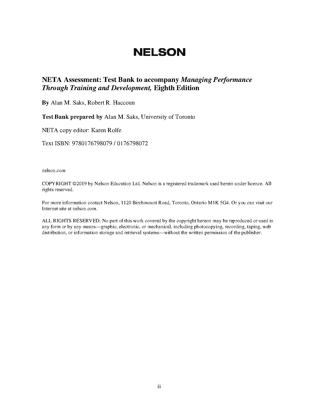 This test bank is designed to accompany the 8th edition of "Managing Performance Through Training and Development" by Alan M. Saks and Robert R. Haccoum. It is a valuable resource for instructors who want to create engaging and challenging assessments for their students. This resource is excellent to help students pass their first attempt on the exam and avoid any resits.