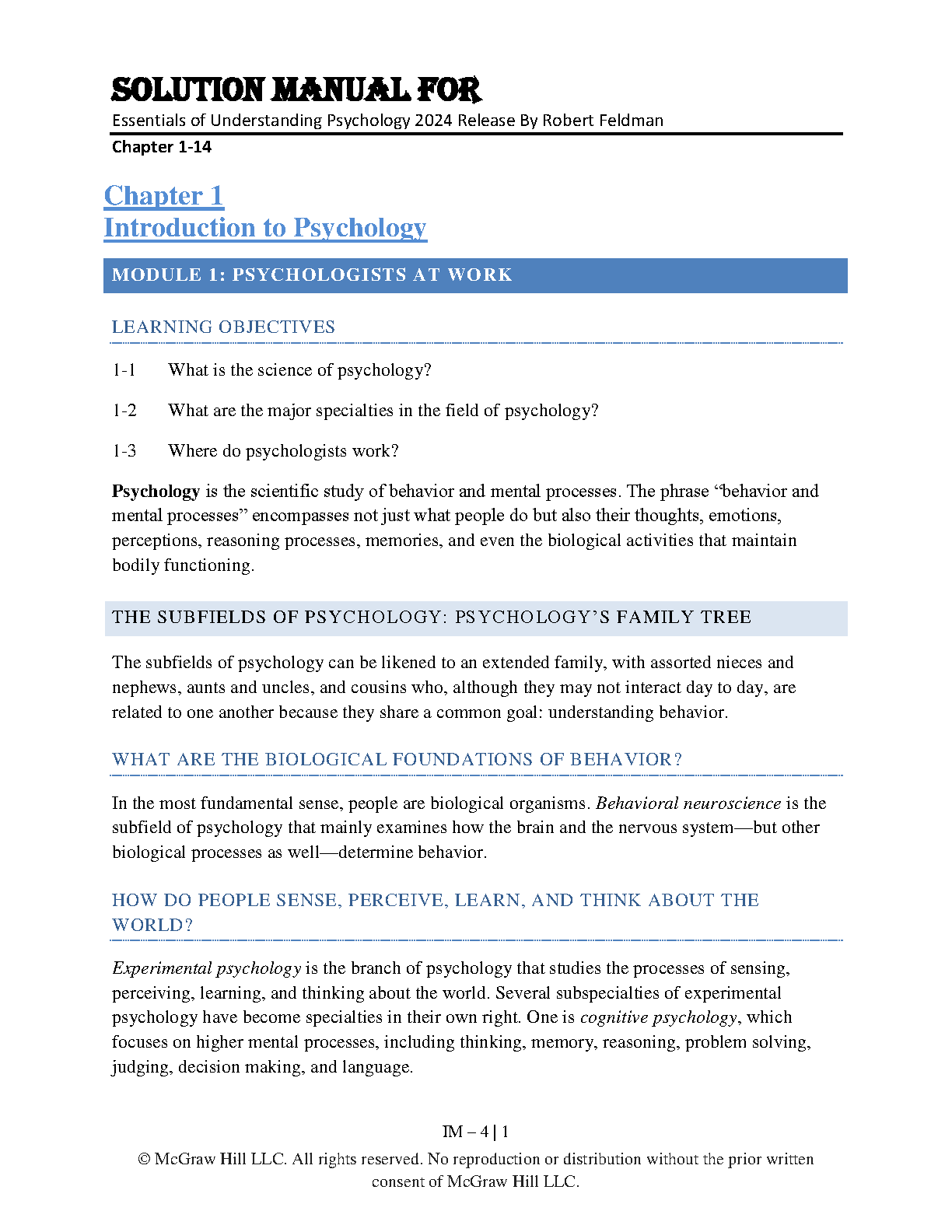 This Solution Manual provides comprehensive answers and explanations for the textbook Essentials of Understanding Psychology 2024 Edition by Robert Feldman. This resource helps students understand the complexities of psychology and provides essential guidance for exam success.