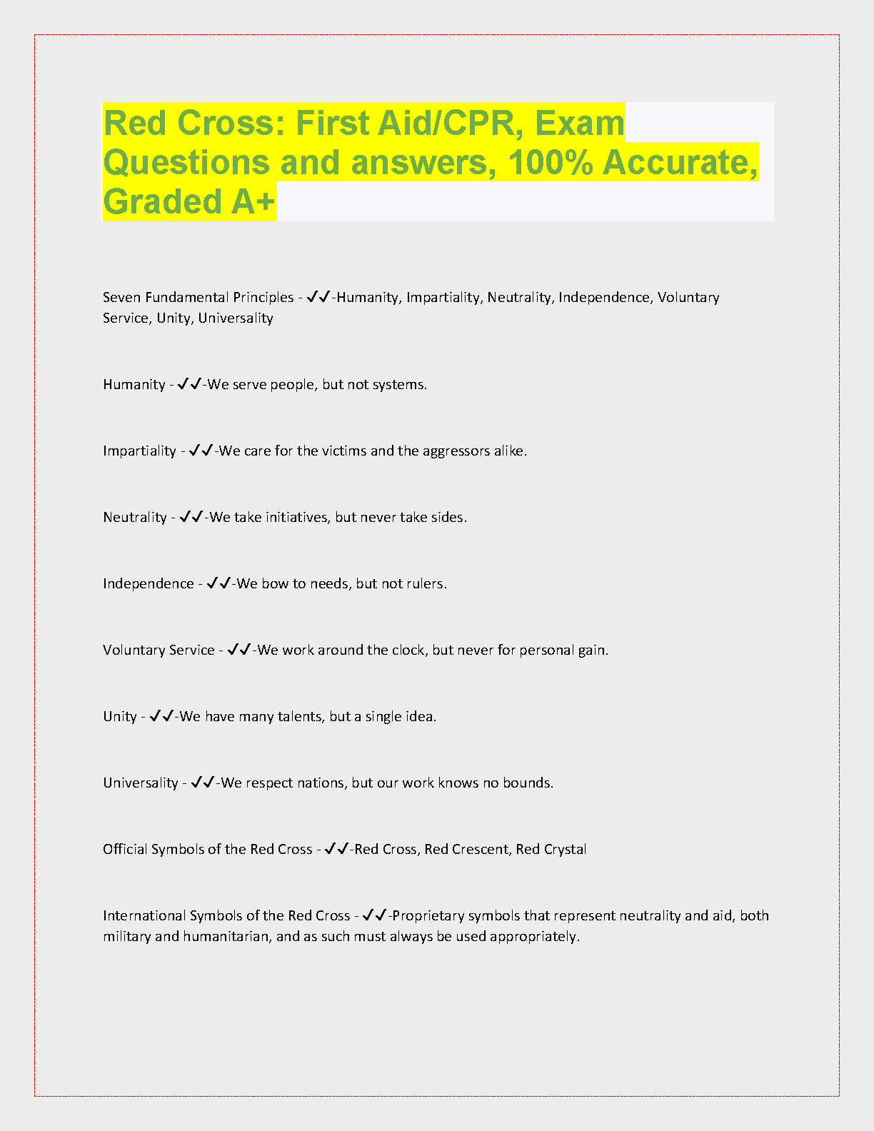 Red Cross First Aid/CPR Exam Questions and Answers, 100% Accurate, Graded A+. This comprehensive resource provides you with all the essential information you need to succeed on your first aid/CPR exam. It is packed with practice questions and detailed answers that cover the key concepts of first aid and CPR. This is the best way to learn the material, and ensure that you are prepared to pass your exam on the first try.