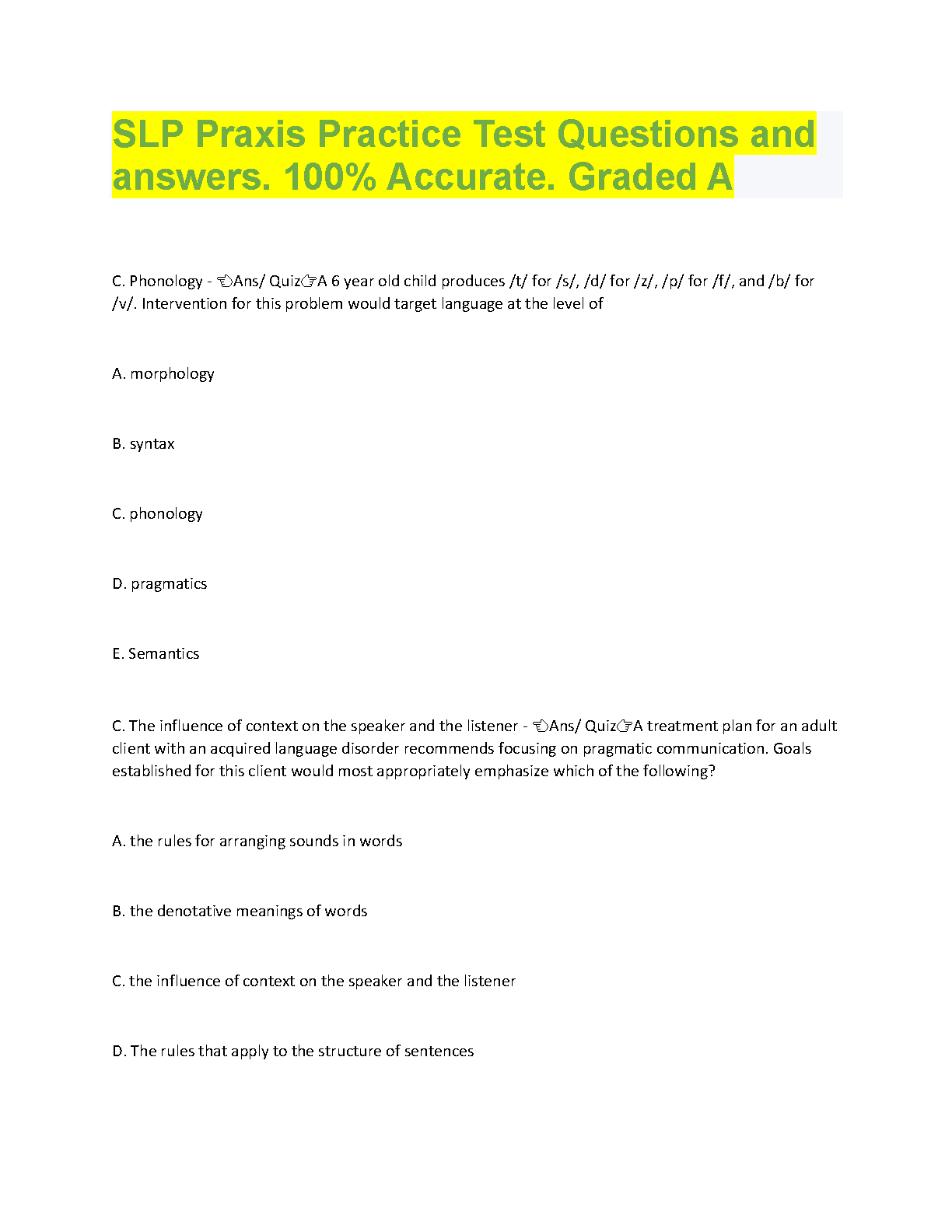 SLP Praxis Practice Test Questions and Answers - 100% Accurate, Graded A