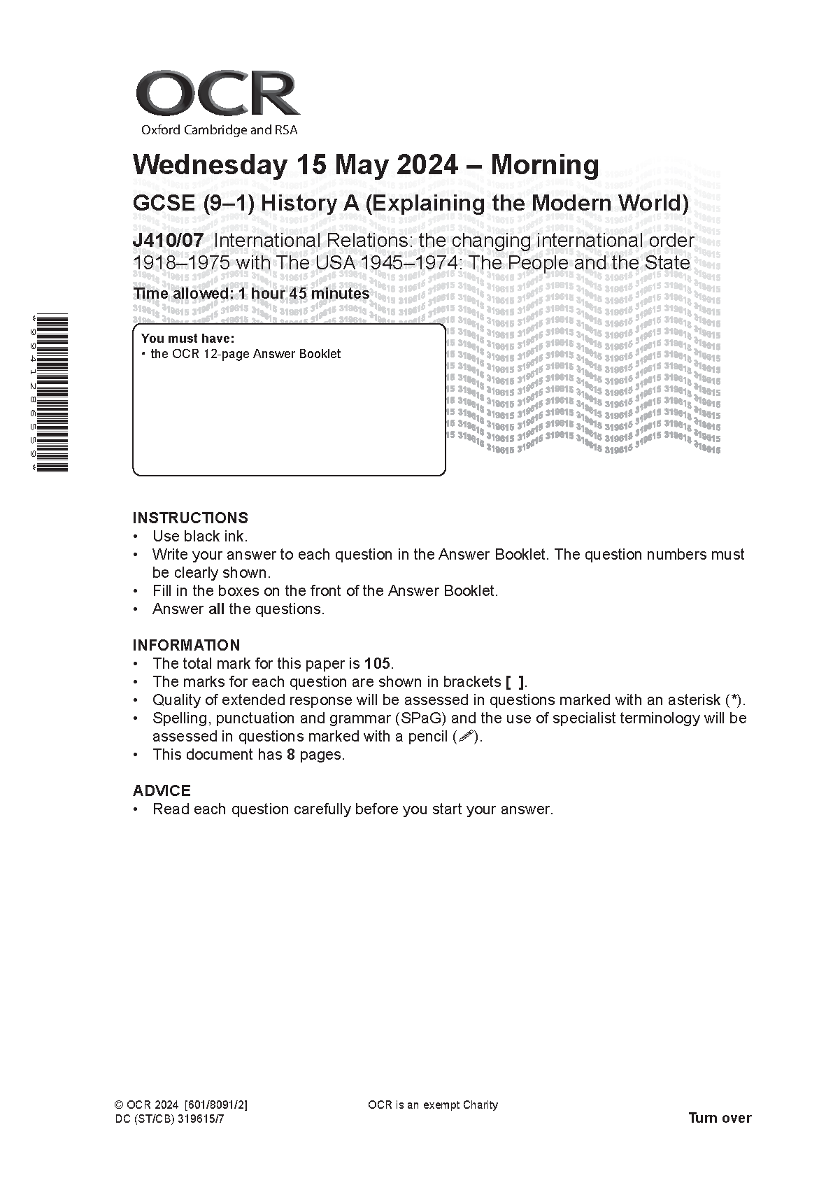 OCR GCSE HISTORY A QUESTION PAPER 7 2024 (J410/07: International Relations: the changing international order 1918–1975 with The USA 1945–1974: The People and the State). DOWNLOAD THE OFFICIAL AND VERIFIED ON www.hackedexams.com INSTANTLY.