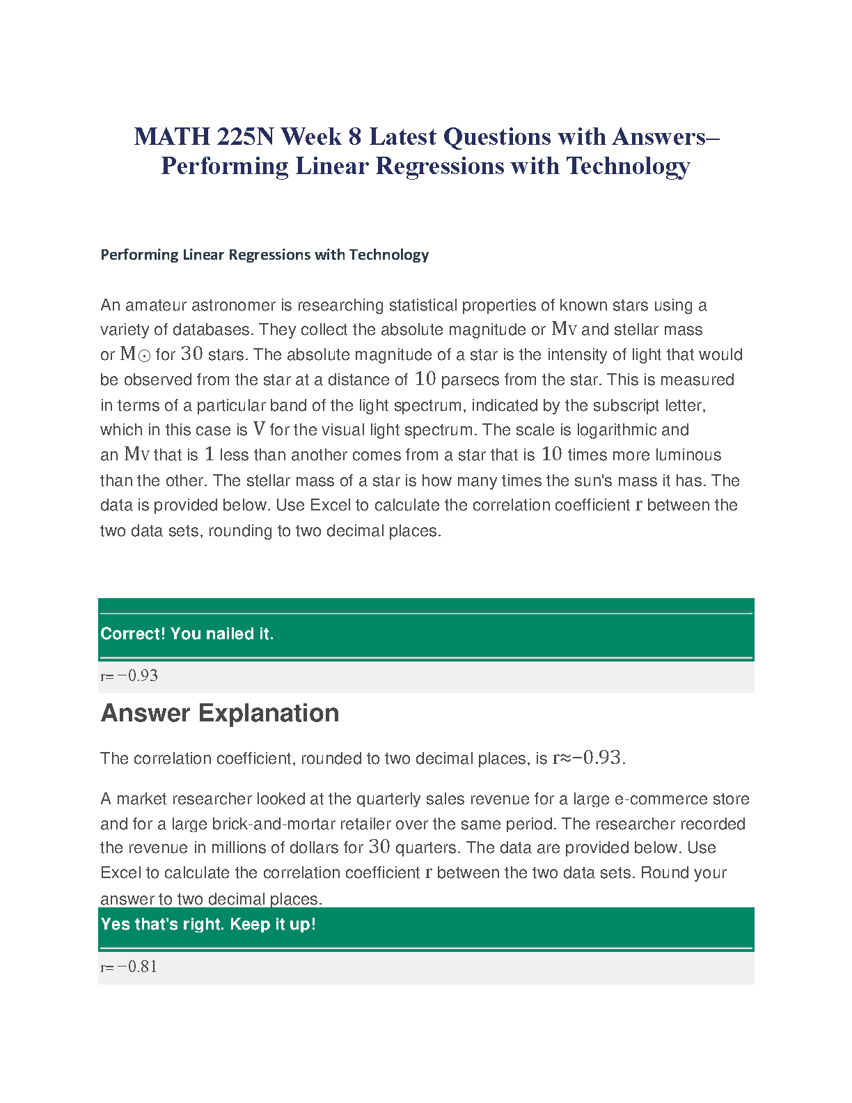 Ace your MATH 225N exams with this comprehensive guide featuring the latest questions and answers for Week 8. Master linear regressions using technology and avoid resits! This resource provides detailed explanations and helps you achieve exam success on your first try.