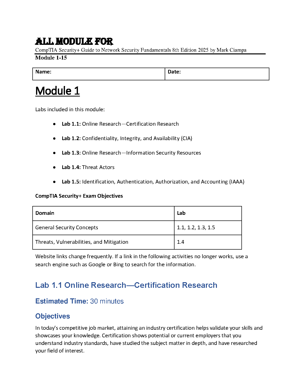 This resource provides a comprehensive guide to Module 1 of the CompTIA Security+ Guide to Network Security Fundamentals, 8th Edition (2025), authored by Mark Ciampa. It covers key concepts and labs, ensuring exam success on the first attempt. Ideal for students preparing for their CompTIA Security+ certification exam.