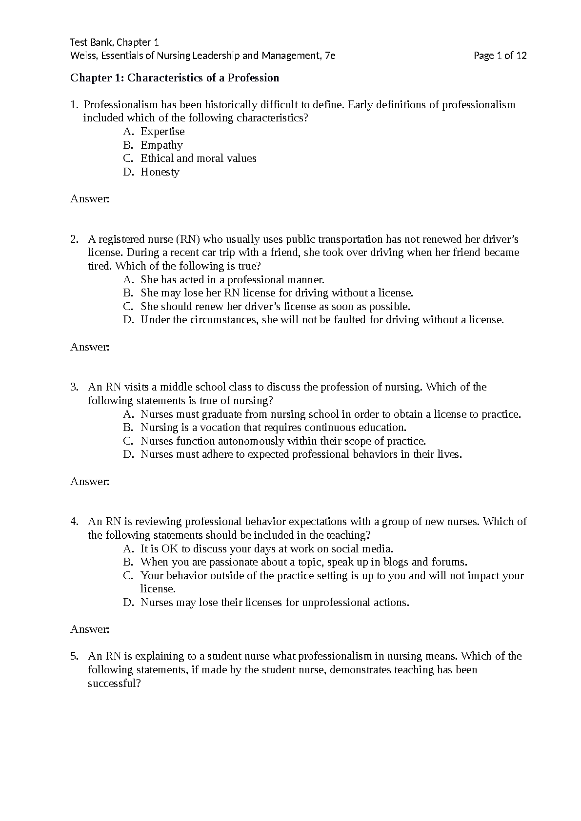 Essentials of Nursing Leadership & Management, 7th Edition Test Bank by Weiss, Tappen, and Grimley