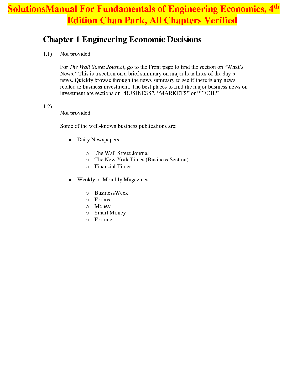Solutions Manual For Fundamentals of Engineering Economics 4th Edition By Chan Park