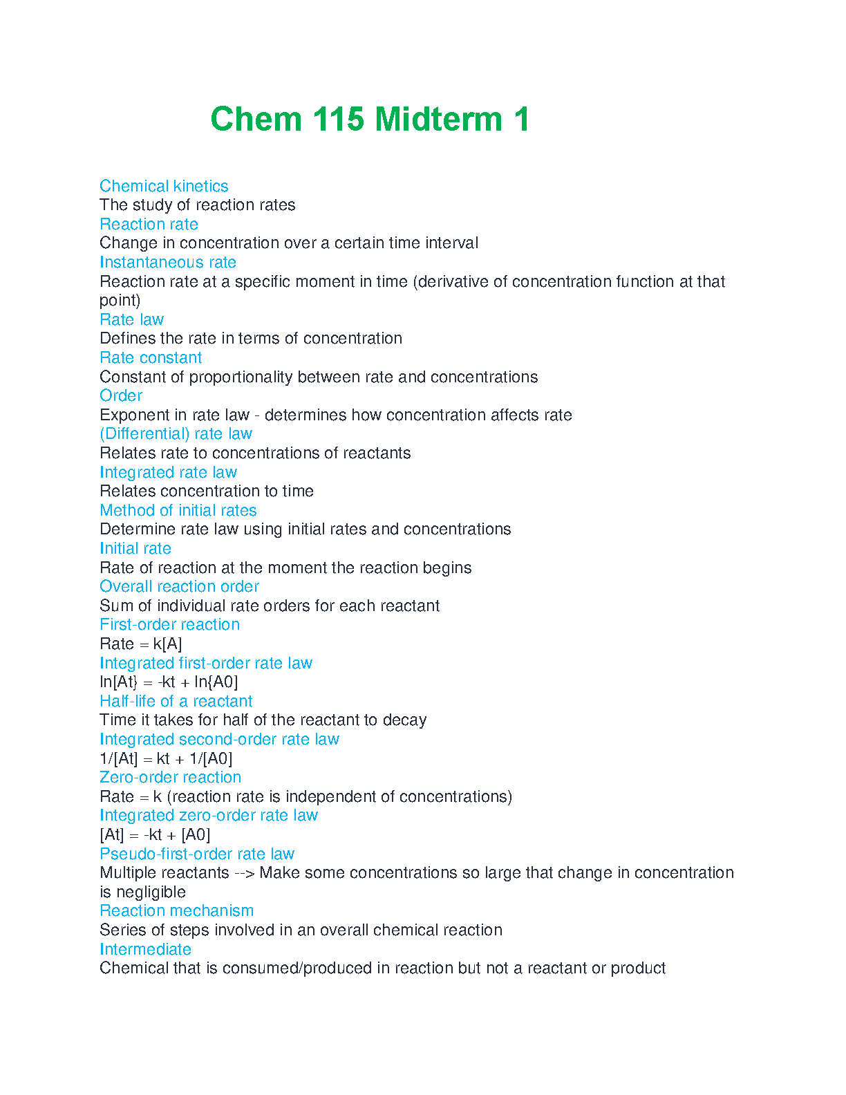 This comprehensive Chem 115 Midterm 1 review guide is designed to help students master chemical kinetics concepts and ace their exams the first time. It covers key topics, including reaction rates, rate laws, and reaction mechanisms, with clear explanations and practice problems. Prepare for success in 2024-2025!