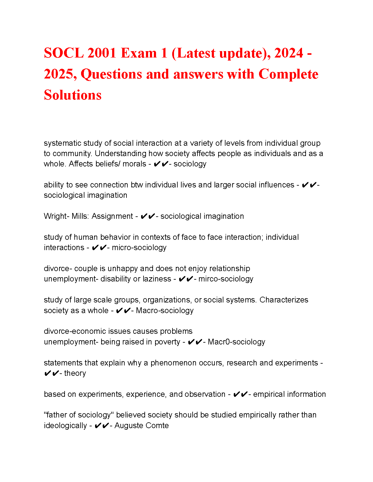 Ace your SOCL 2001 Exam 1 with this comprehensive guide featuring questions and answers, complete solutions, and a latest update for the 2024-2025 academic year. Avoid resits and pass on your first attempt.