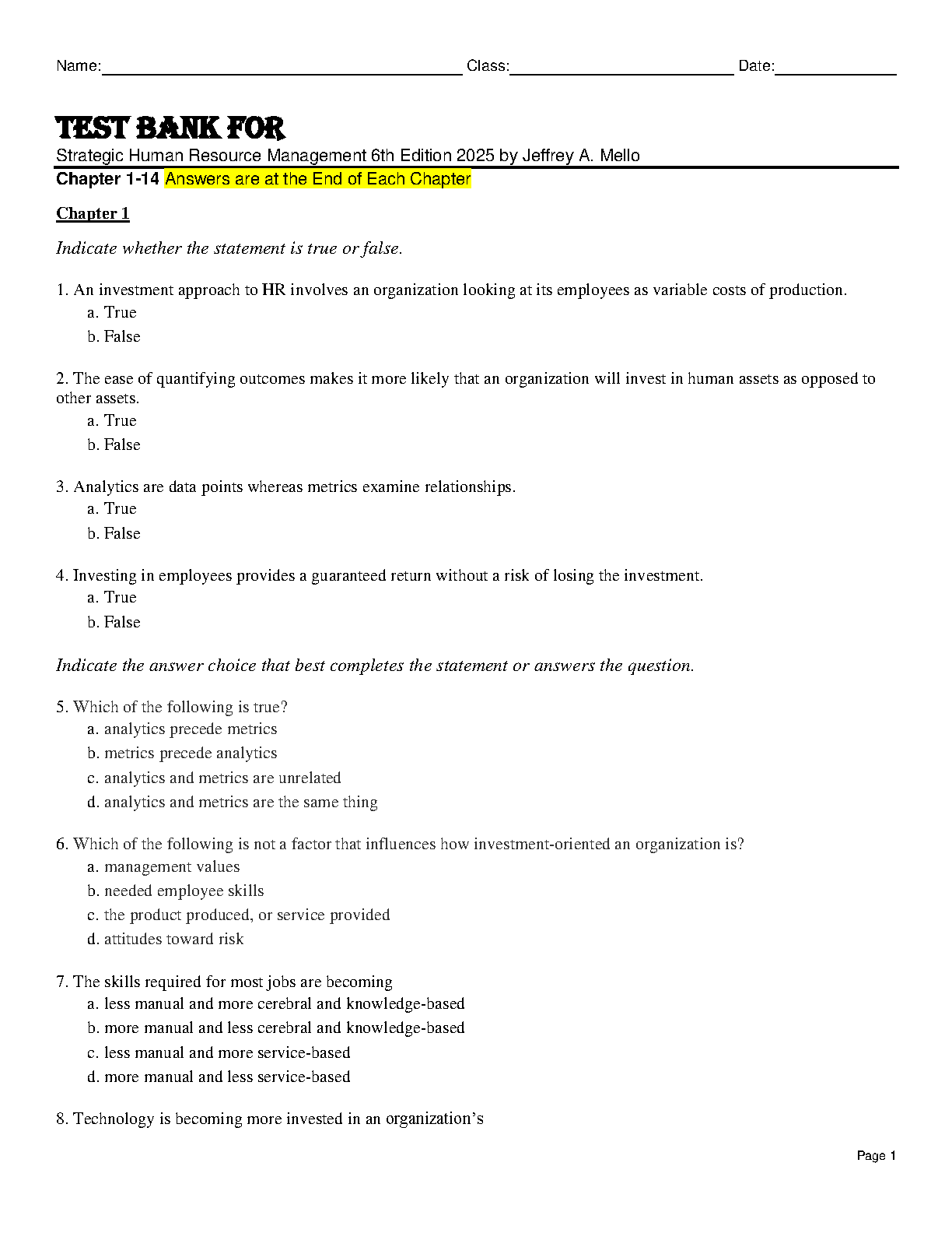 Strategic Human Resource Management 6th Edition 2025 Test Bank by Jeffrey A. Mello