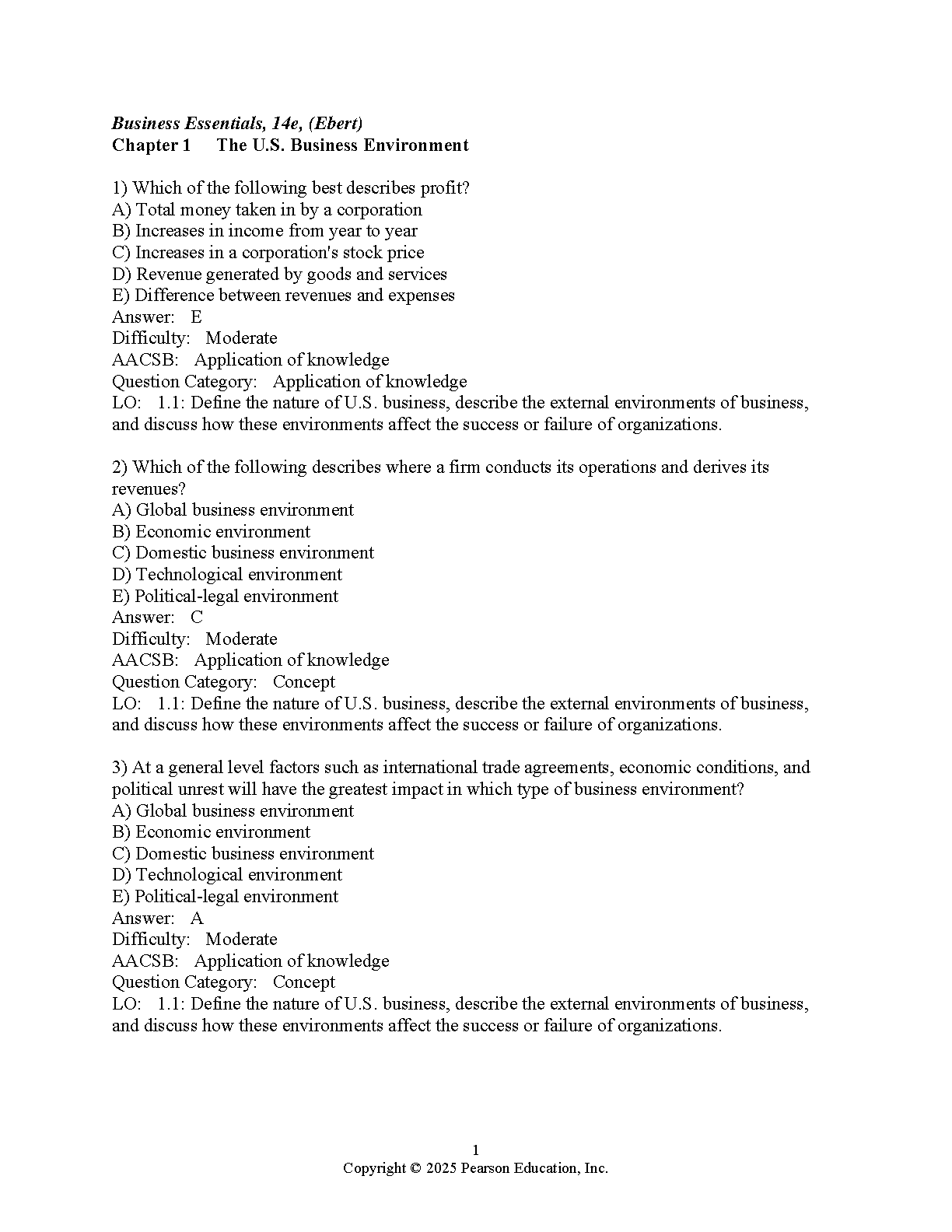 Ace your Business Essentials exams on the first try with this comprehensive test bank! This resource, developed for the 14th edition by Ebert, covers all aspects of the U.S. business environment. Get ready to conquer the material and avoid resits.