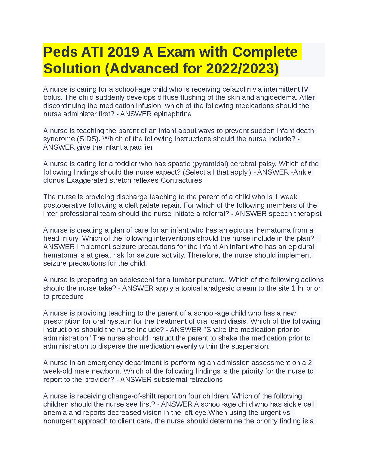 Peds ATI 2019 A Exam with Complete Solution (Advanced for 2022/2023). DOWNLOAD on www.hackedexams.com INSTANTLY.