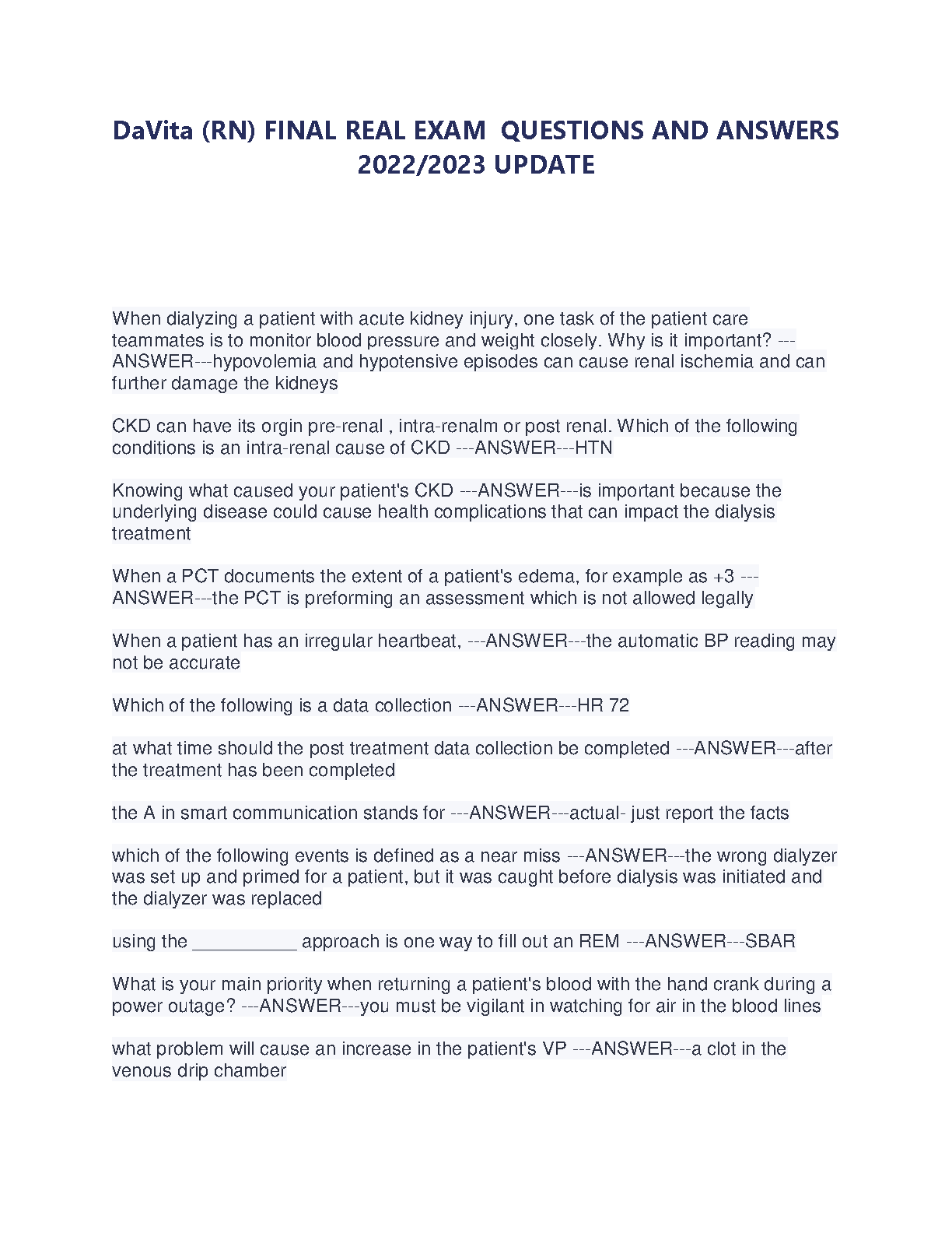 Prepare for your DaVita (RN) final exam with this comprehensive set of questions and answers covering key concepts from the 2022/2023 curriculum. This resource is designed to help students pass their exams on the first attempt.