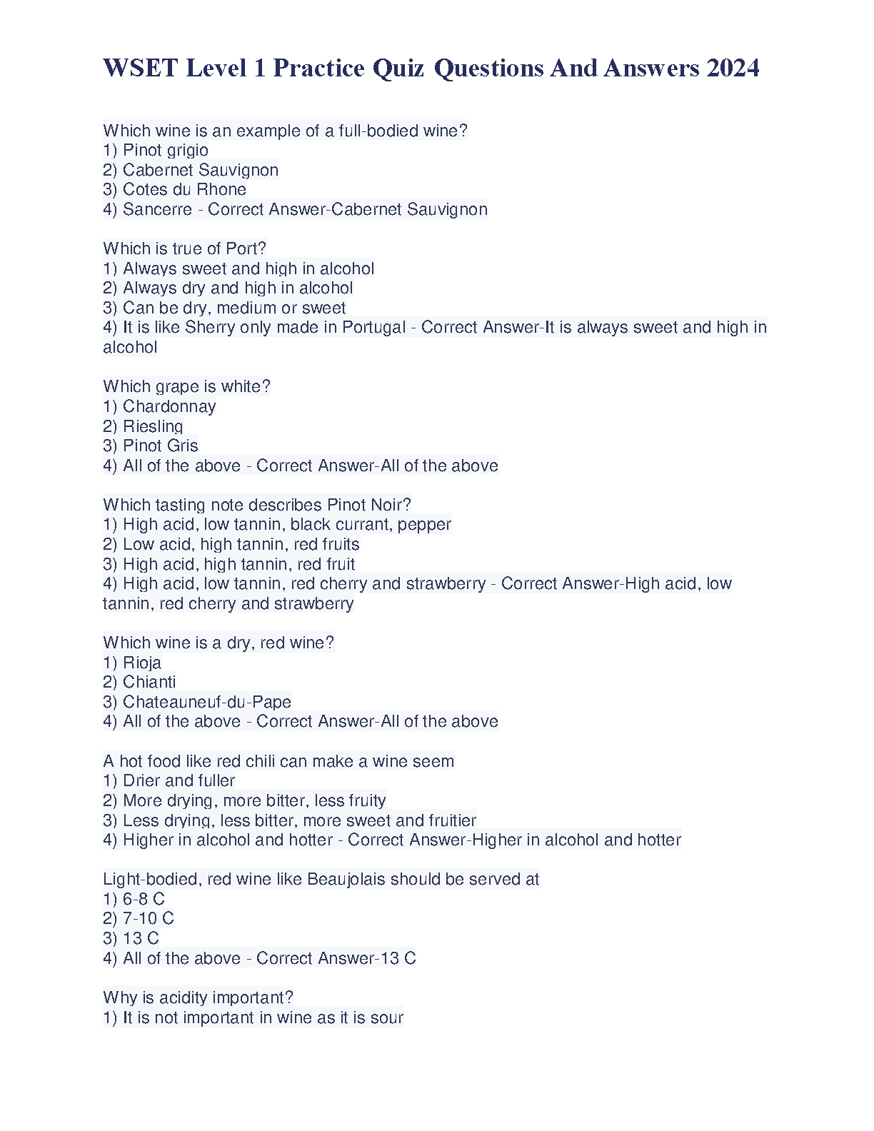 WSET Level 1 Award in Wines 2024 Practice Quiz Questions and Answers