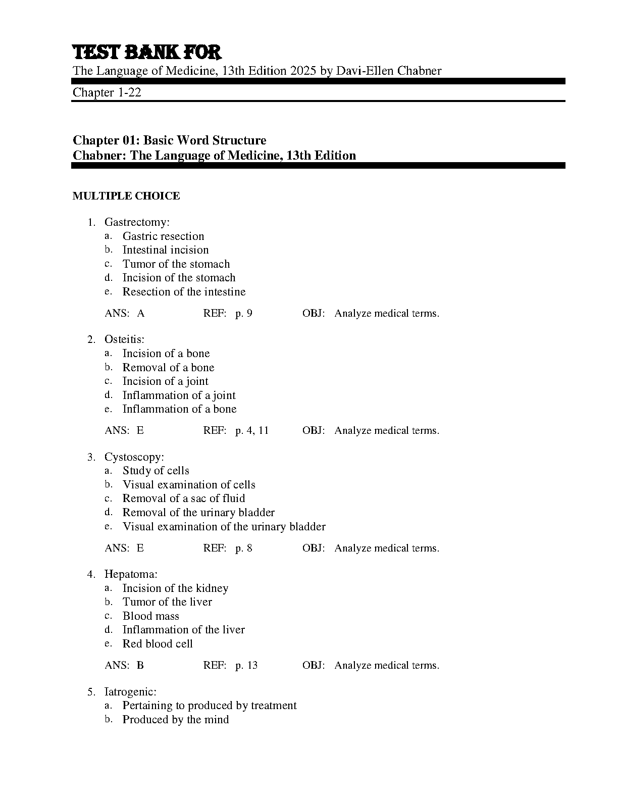 Access this comprehensive test bank for Davi-Ellen Chabner's "The Language of Medicine, 13th Edition," designed to help students master medical terminology and ace their exams. This resource provides multiple choice questions to strengthen understanding and improve exam performance. Prepare effectively and avoid resits!