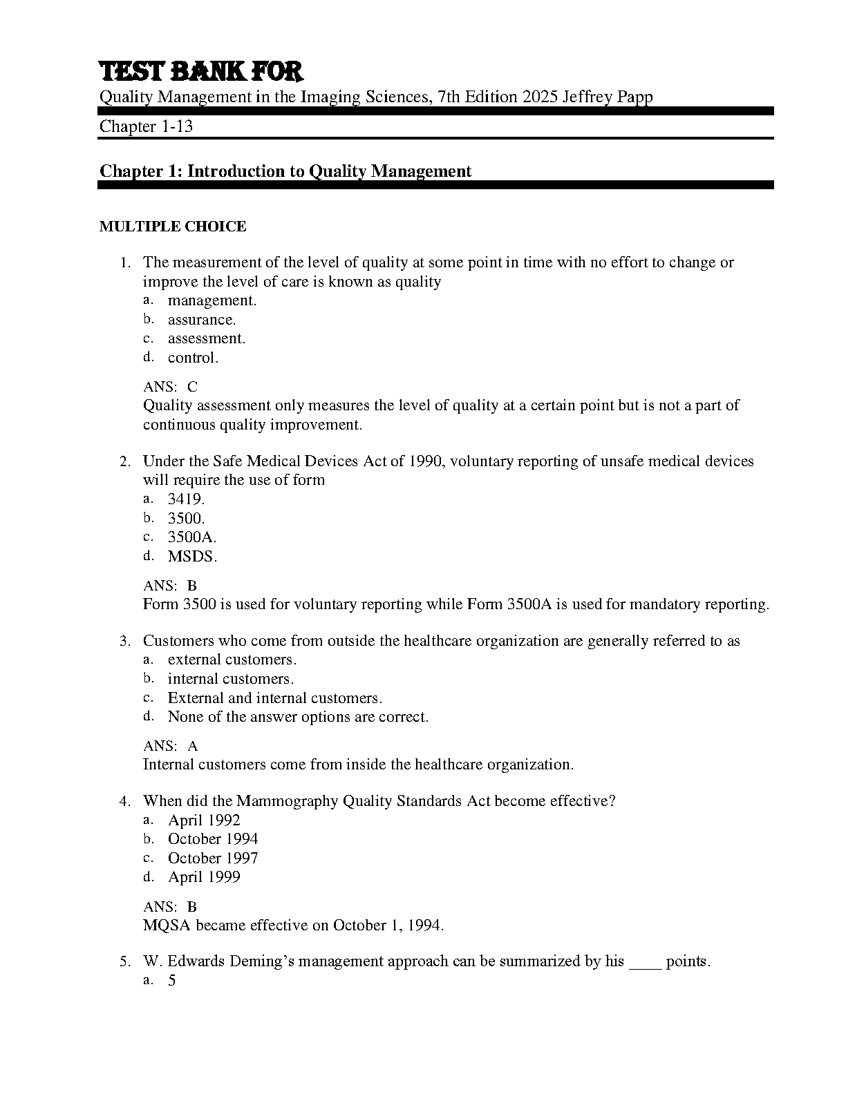 Quality Management in the Imaging Sciences, 7th Edition 2025 Test Bank by Jeffrey Papp