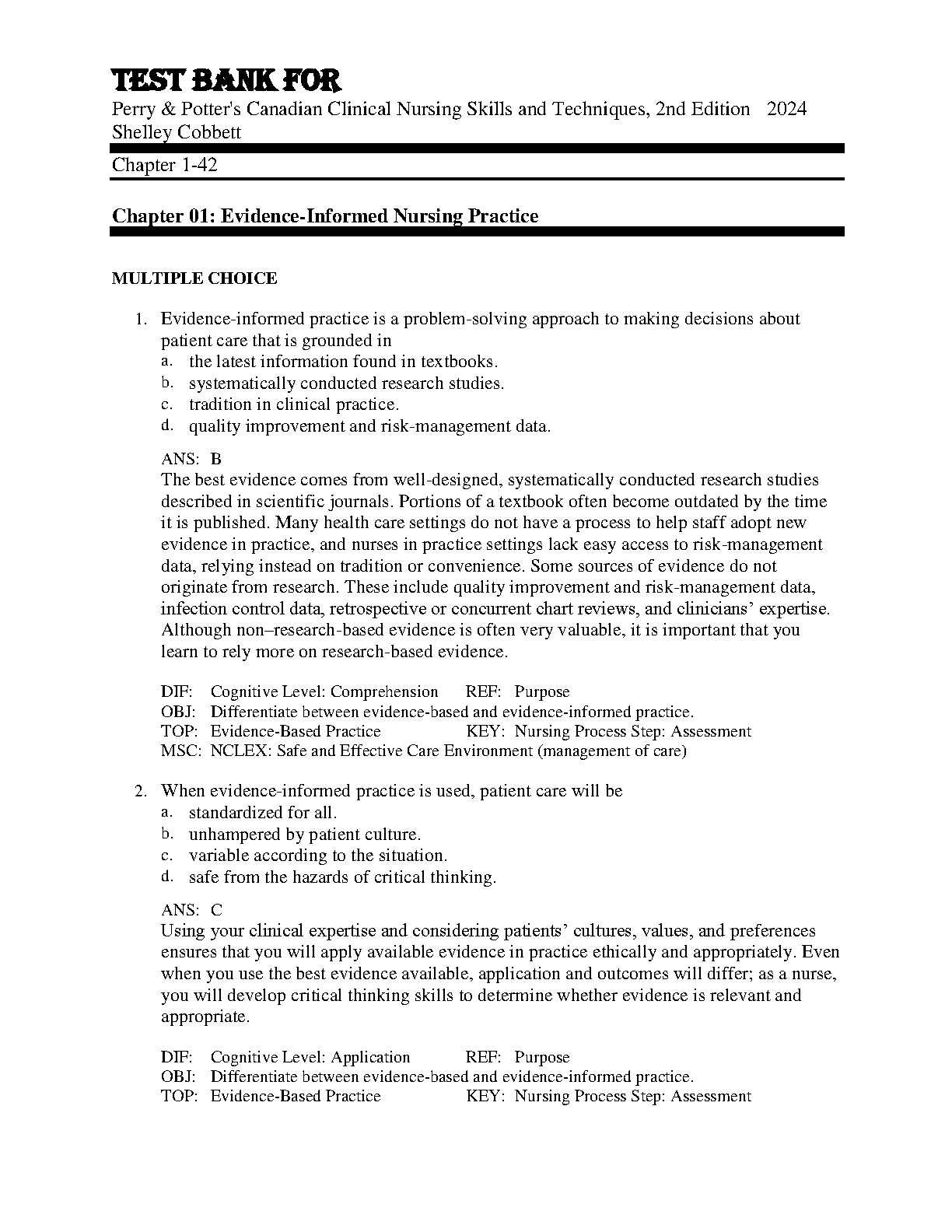 Access the complete Test Bank for Perry & Potter's Canadian Clinical Nursing Skills and Techniques, 2nd Edition 2024. This resource is designed to help nursing students master the material and ace their exams on the first attempt, minimizing the need for resits. This comprehensive resource covers all chapters and provides valuable practice questions and answers.