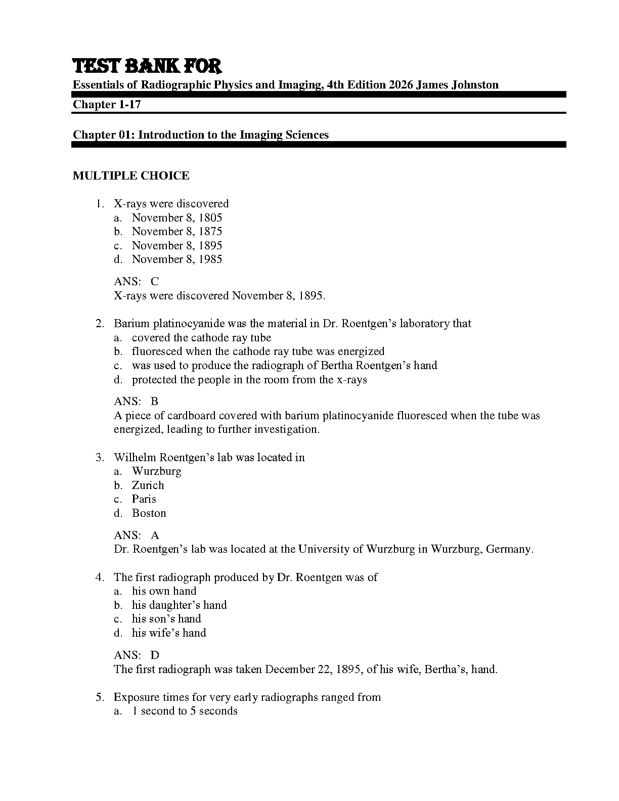 Essentials of Radiographic Physics and Imaging, 4th Edition 2026 Test Bank by James Johnston