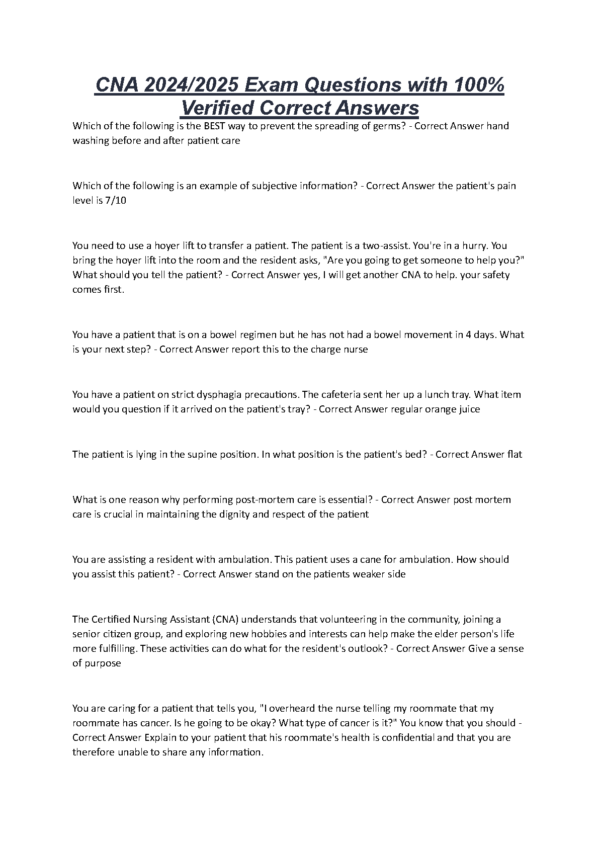 Ace your CNA exam with this comprehensive set of 2024/2025 exam questions and 100% verified answers. Designed to help students pass on their first attempt, avoiding costly resits.