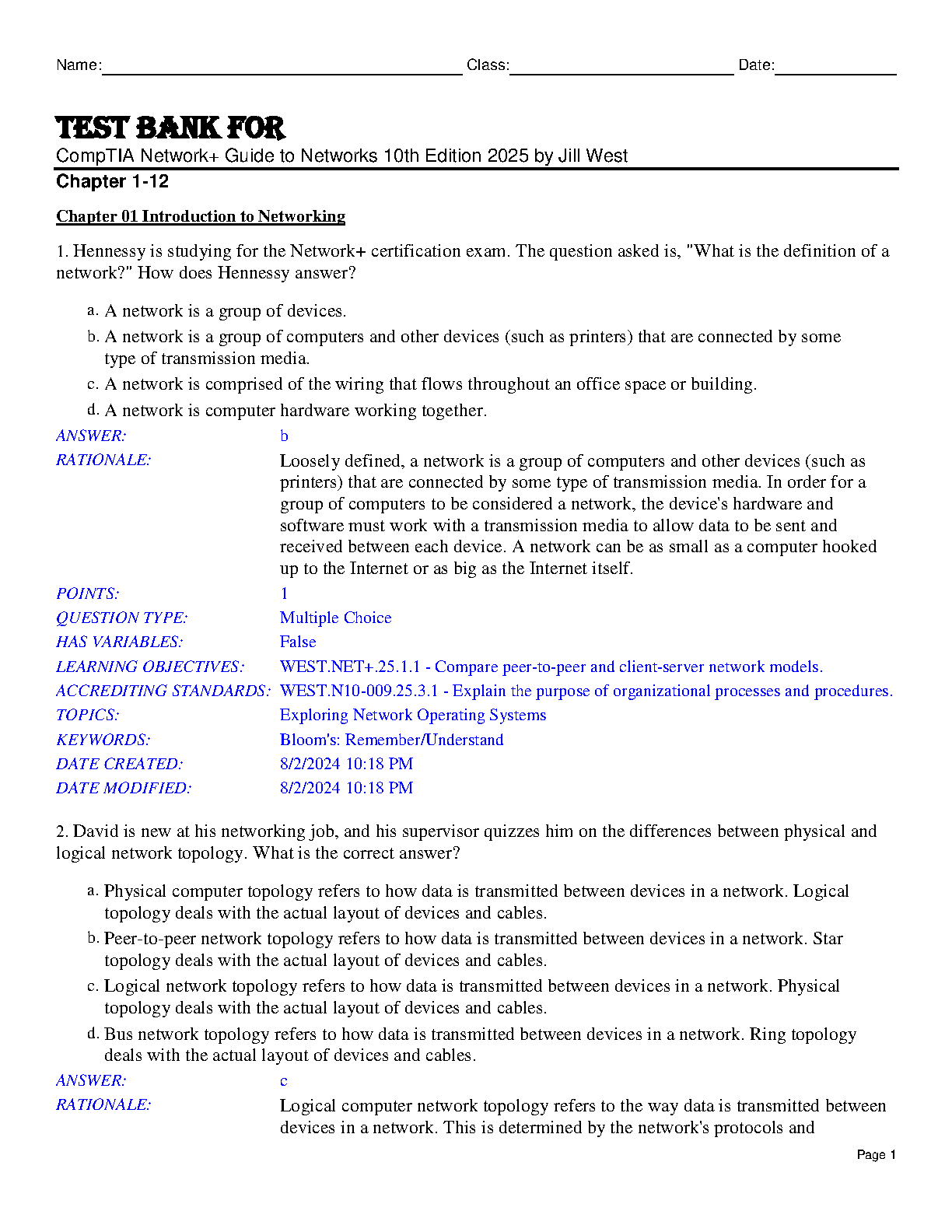 Ace your CompTIA Network+ exam with this comprehensive test bank for the 10th edition (2025) by Jill West. Prepare effectively and avoid resits with this resource designed for first-attempt success.