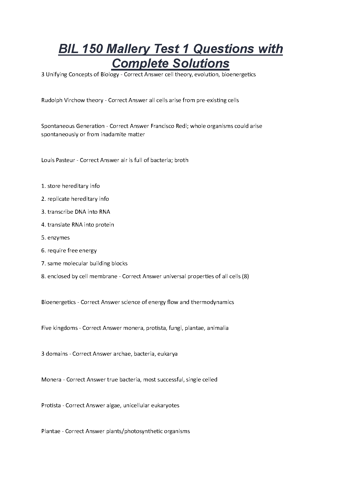 Ace your BIL 150 exam with this comprehensive guide featuring complete solutions to Test 1 questions. Master cell theory, evolution, bioenergetics, and key concepts, ensuring a first-time pass. Ideal for students aiming for exam success in the 2024/2025 academic year.