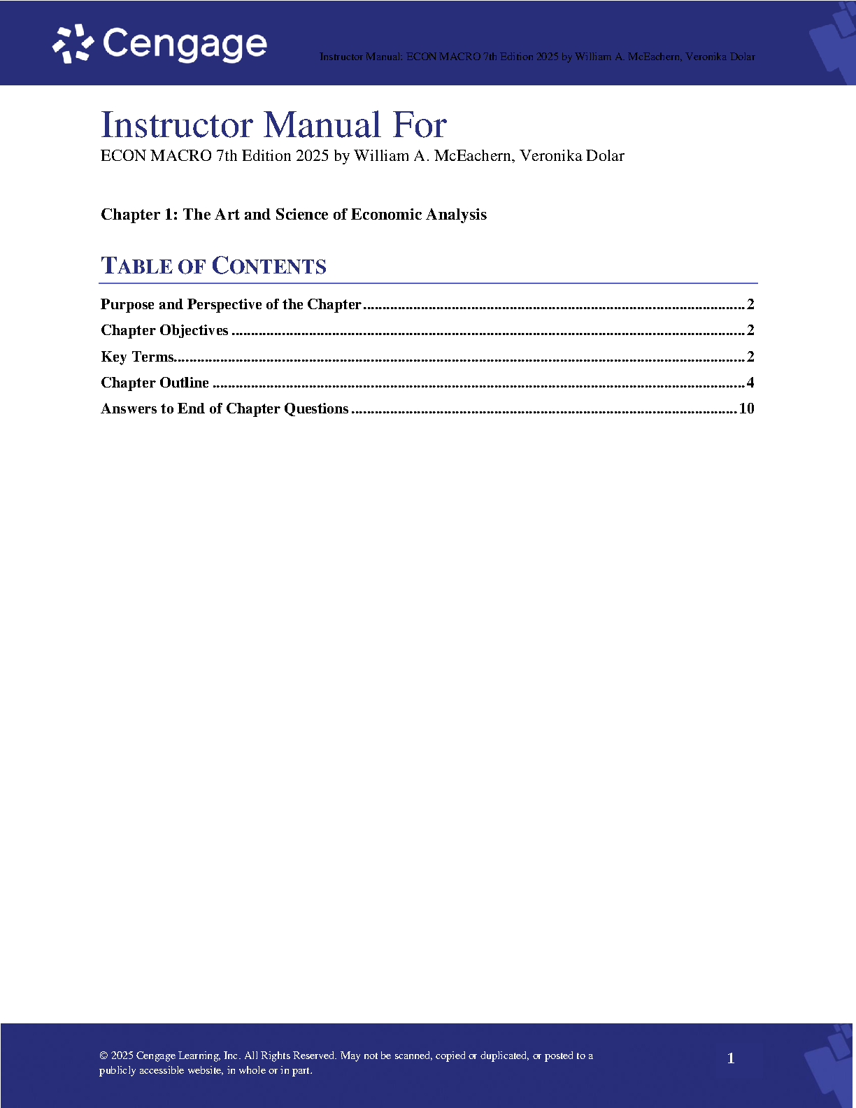 Access the complete instructor manual for ECON MACRO 7th Edition 2025, authored by William A. McEachern and Veronika Dolar. This resource provides comprehensive support for instructors, including chapter outlines, key terms, objectives, and answers to end-of-chapter questions, ensuring effective teaching and student success.