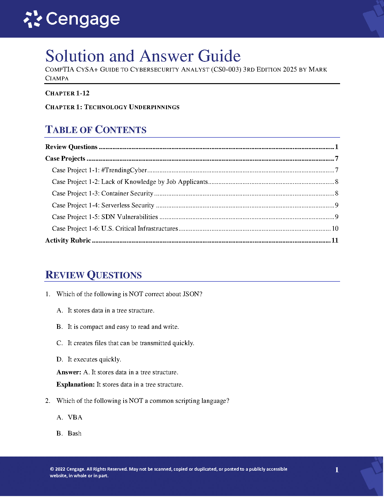 Ace your CompTIA CySA+ exam with this comprehensive solution manual for the 3rd edition (2025) by Mark Ciampa. This resource provides detailed explanations and answers to all the review questions and case projects, ensuring you master the concepts and confidently pass your exam on the first attempt. Avoid resits and achieve academic success.