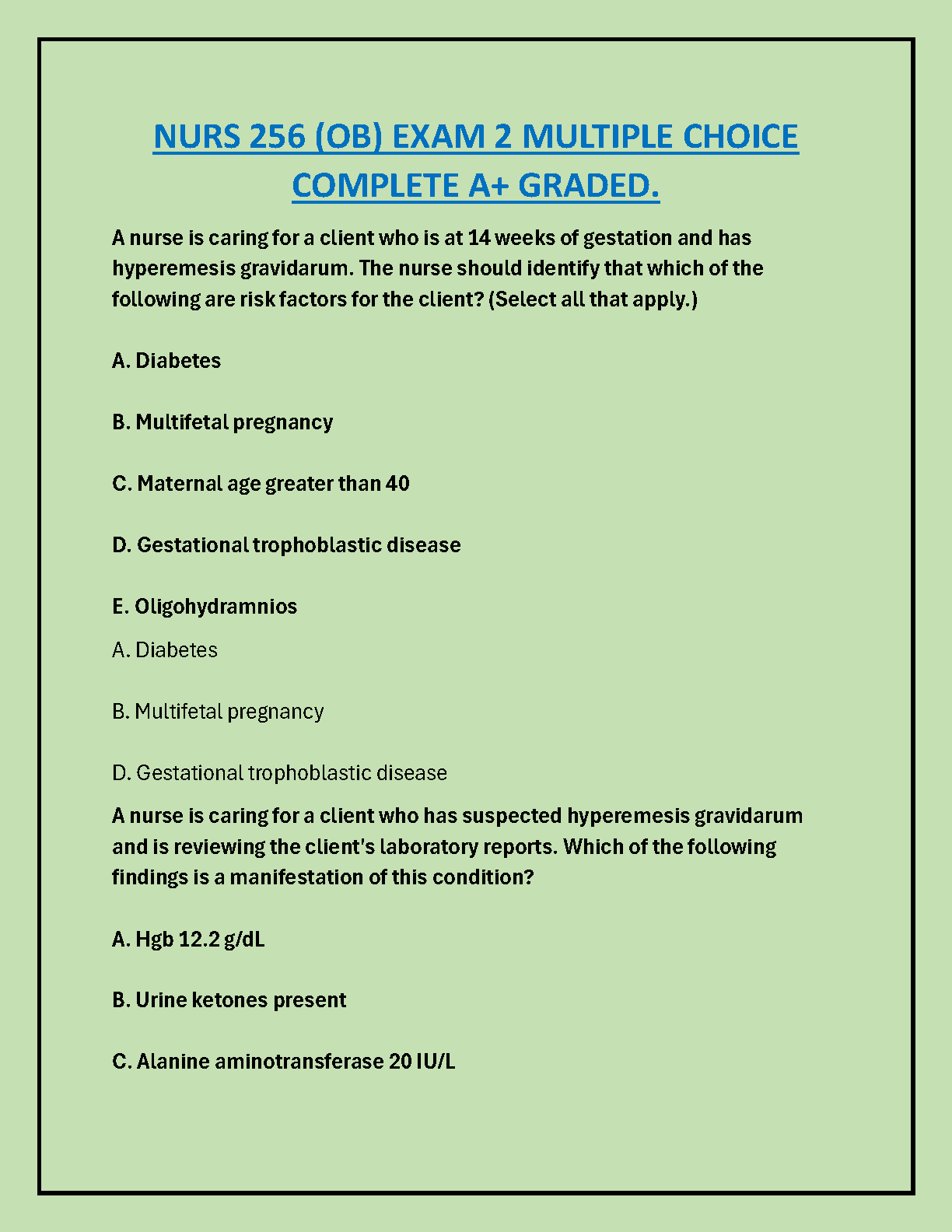 Ace your NURS 256 (OB) Exam 2 with this comprehensive study guide featuring multiple choice questions and answers. This A+ graded resource is designed to help nursing students pass their exams on the first attempt, avoiding costly resits.