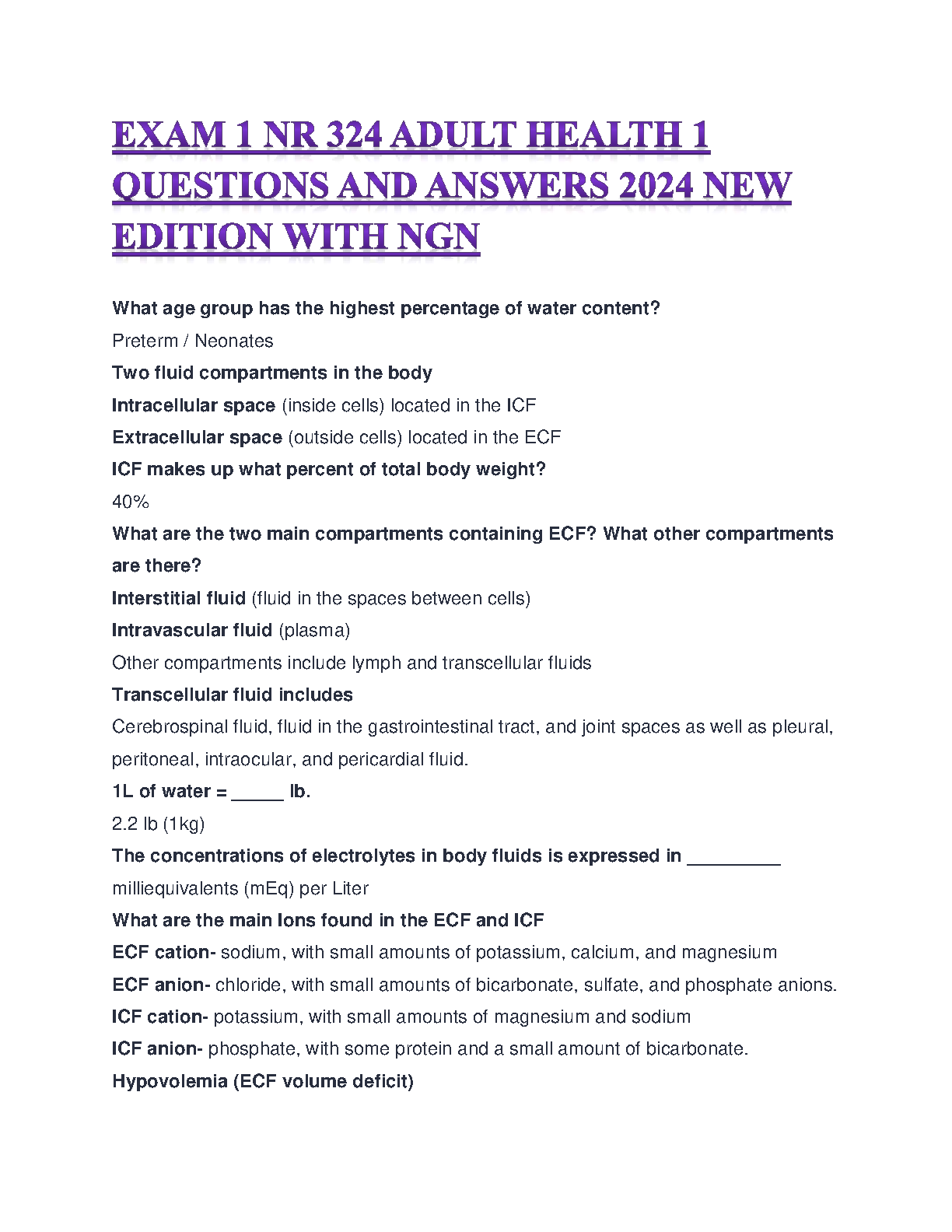 Ace your NR 324 Adult Health 1 Exam with this comprehensive question and answer guide. This 2024 new edition includes NGN updates and covers key concepts for exam success. Avoid resits and pass on your first attempt.