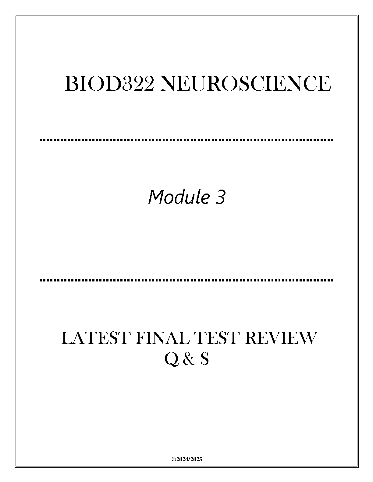 Ace your BIOD322 Neuroscience final exam with this comprehensive review guide covering Module 3. Prepare effectively and avoid resits with this up-to-date 2024-2025 resource, designed to help you pass on your first attempt.