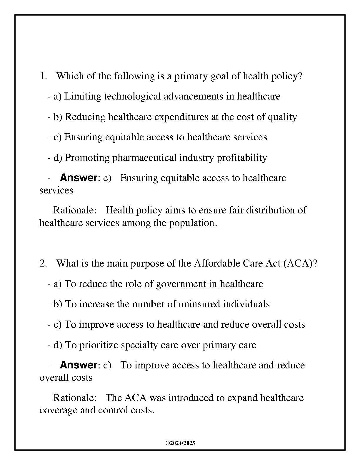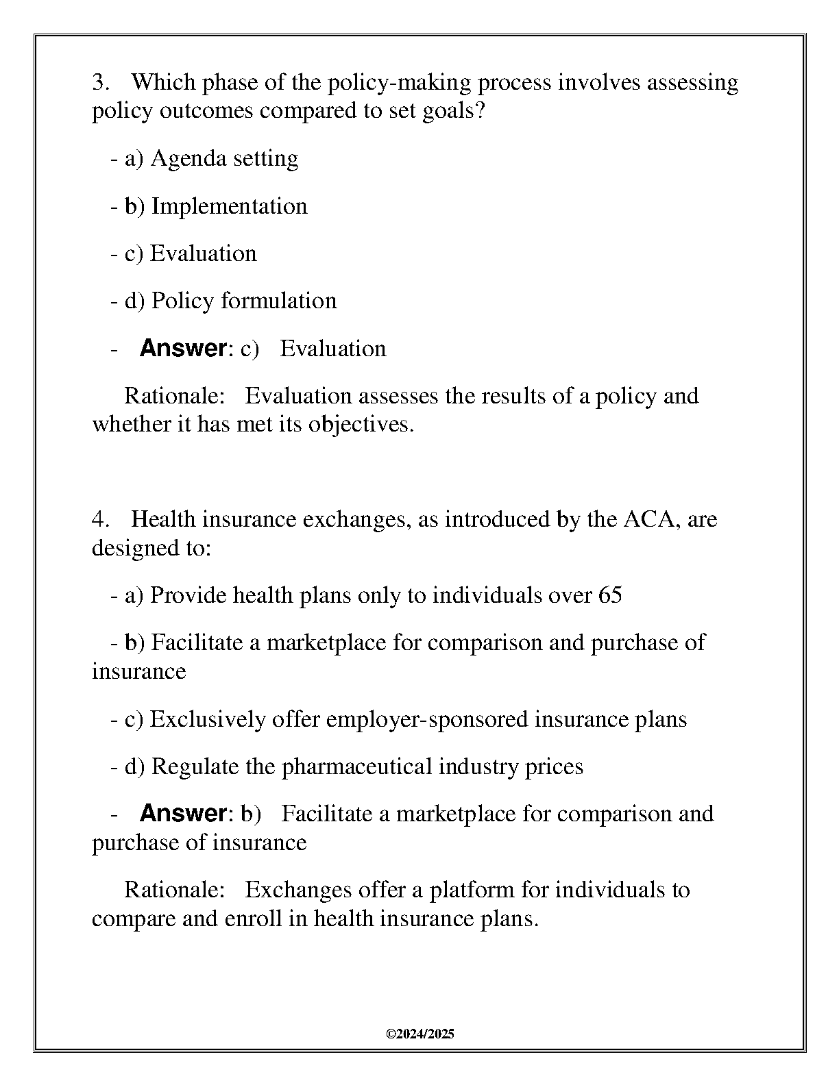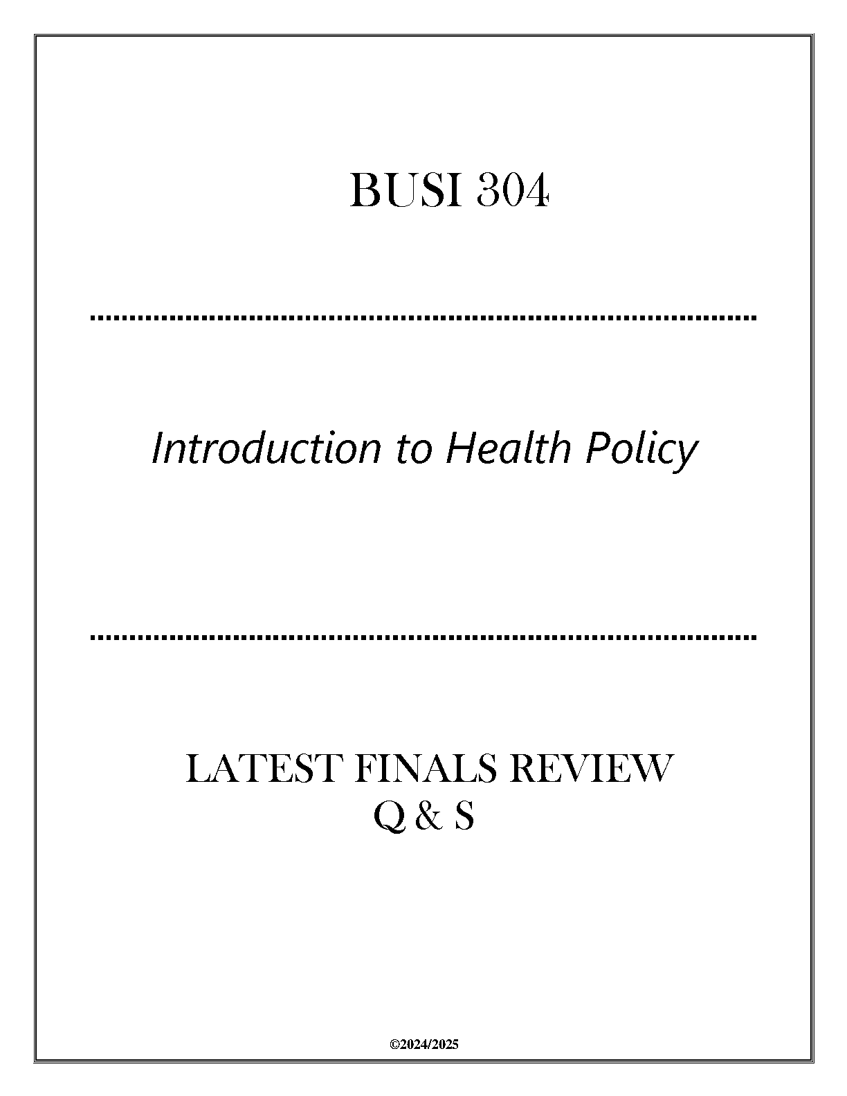 BUSI 304 Introduction to Health Policy: Latest Finals Review Q&A for 2024-2025 Academic Year