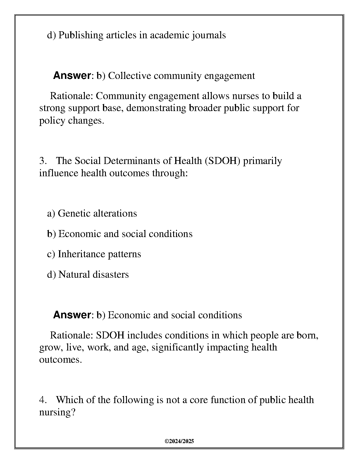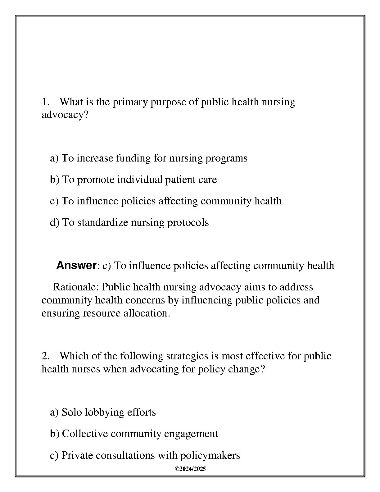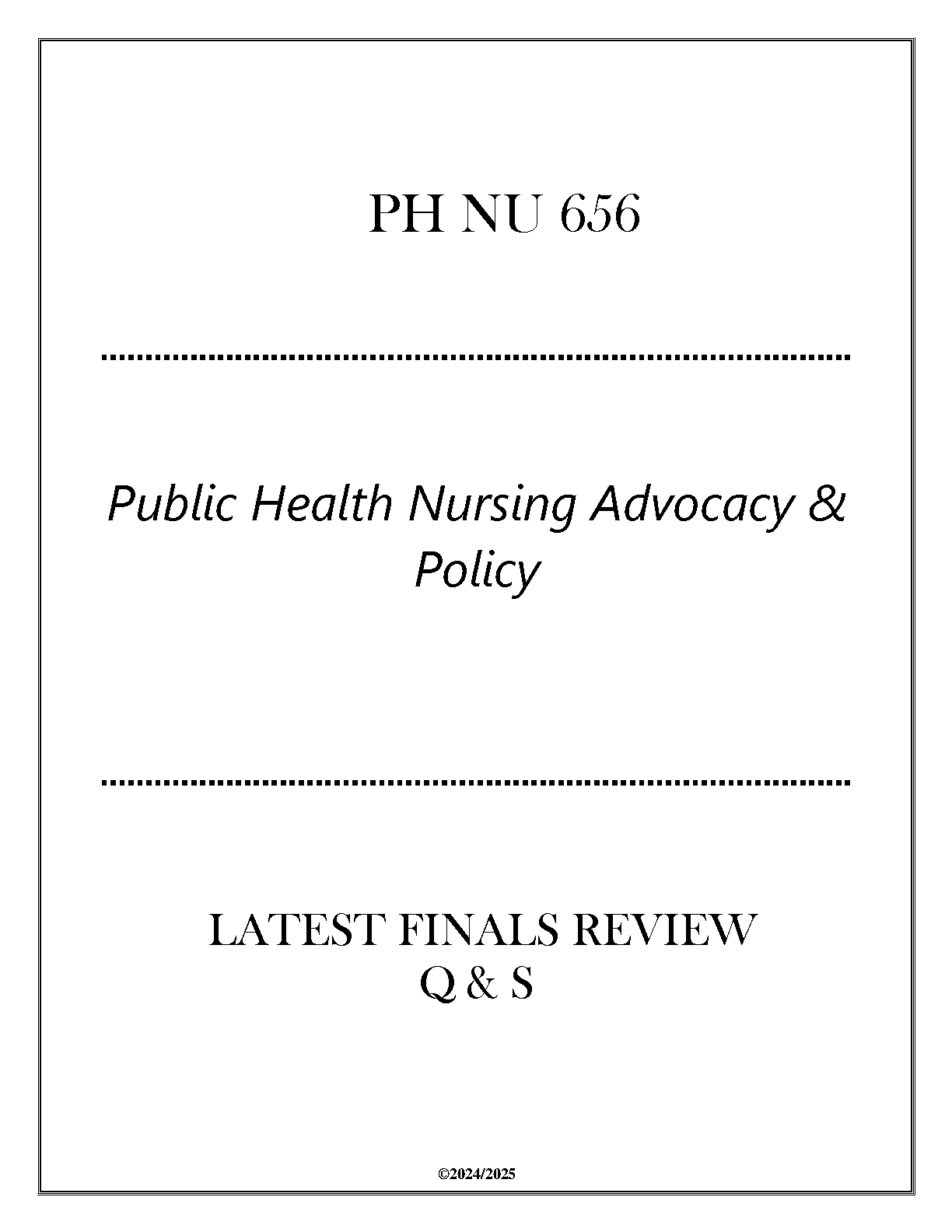 Ace your PHNU 656 Public Health Nursing Advocacy & Policy final exam with this comprehensive 2024-2025 review guide. Prepare effectively and avoid resits with our expertly curated questions and answers covering all key course topics. This resource is your ultimate tool for achieving top marks.