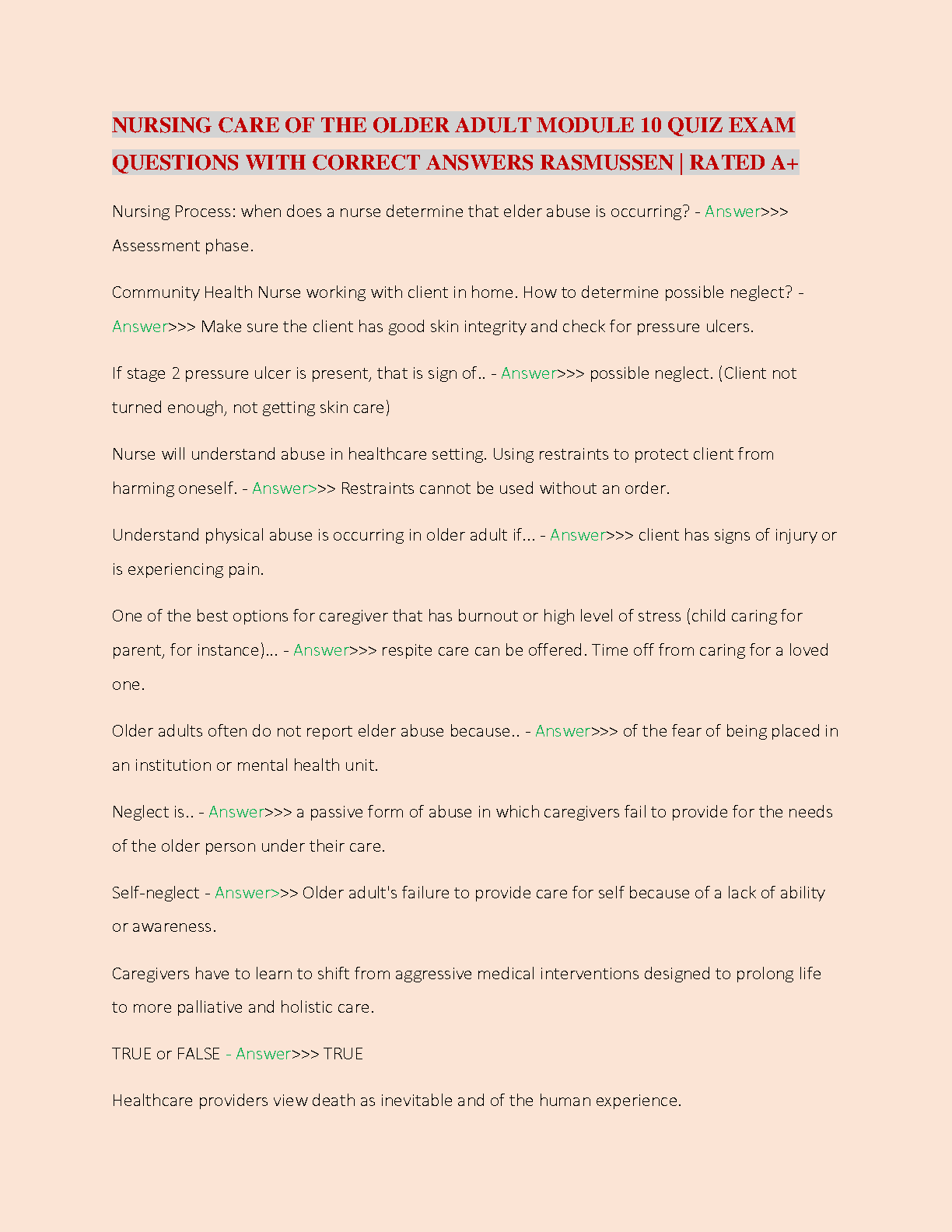 Nursing Care of the Older Adult Module 10 Quiz Exam Questions with Correct Answers: Rasmussen Edition