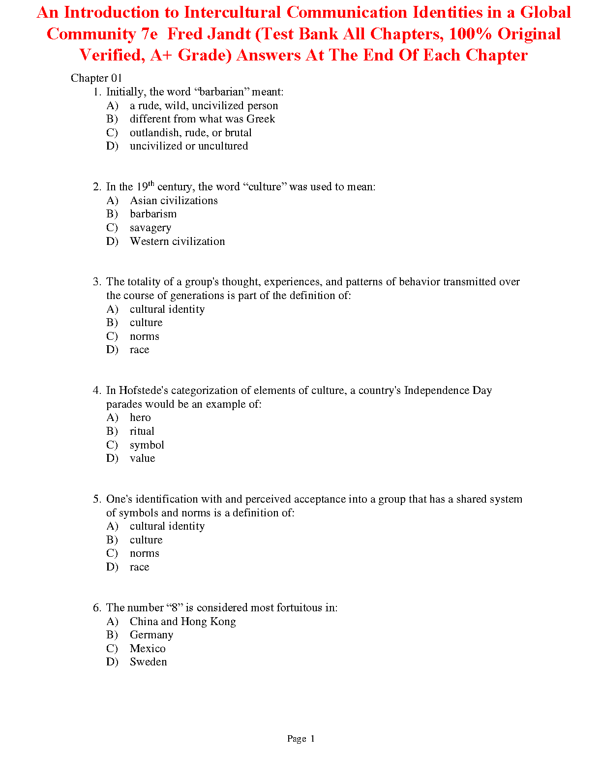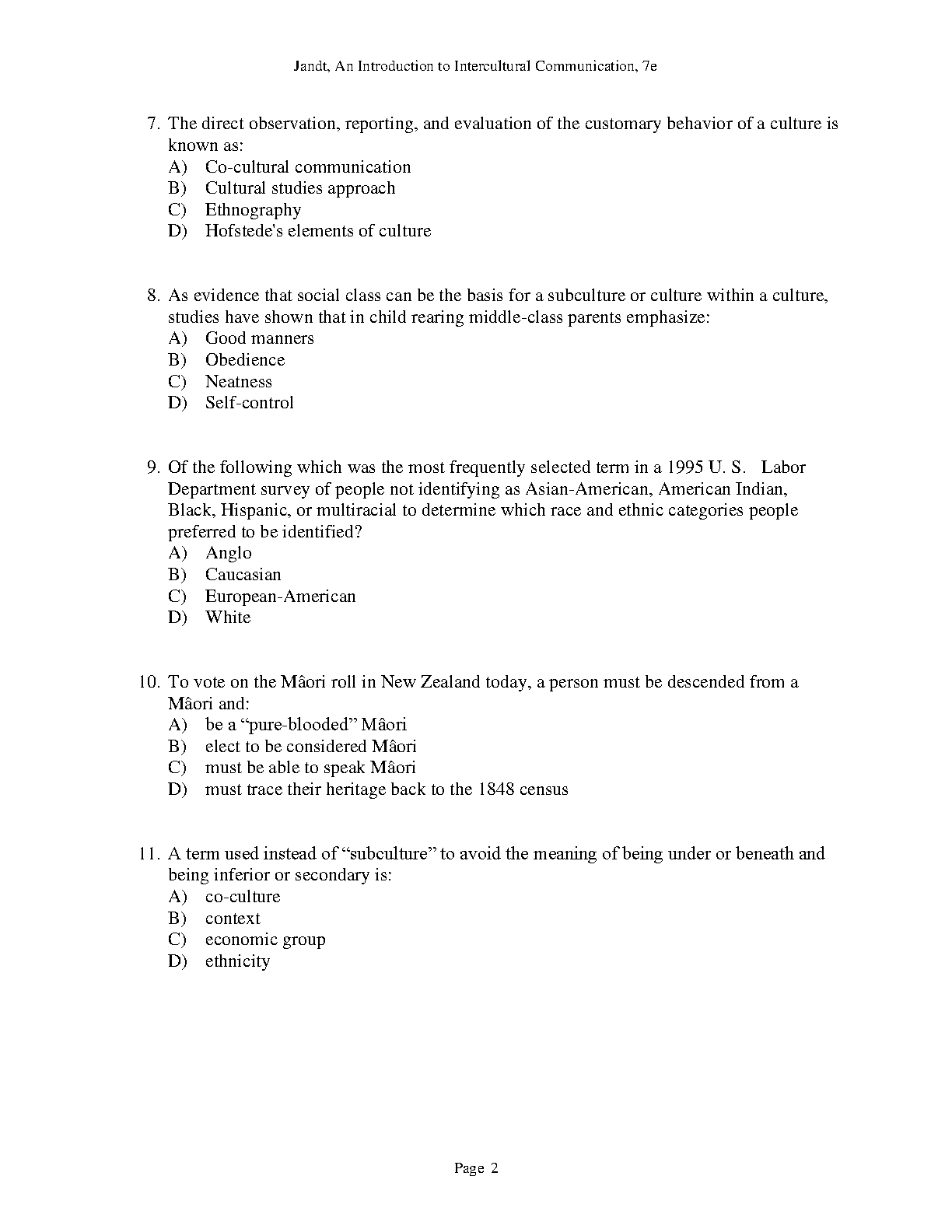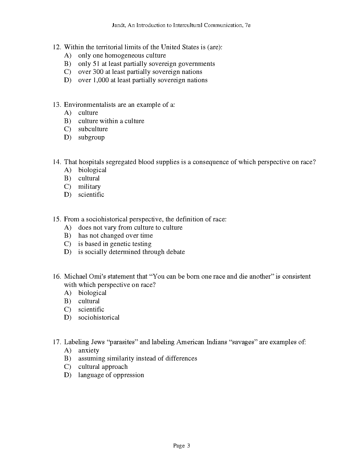 Access the complete test bank for Fred Jandt's An Introduction to Intercultural Communication Identities in a Global Community, 7th edition. This resource contains all chapters, is 100% original and verified, and guarantees an A+ grade. Answers are provided at the end of each chapter for effective self-assessment. Prepare for exams confidently and avoid resits.