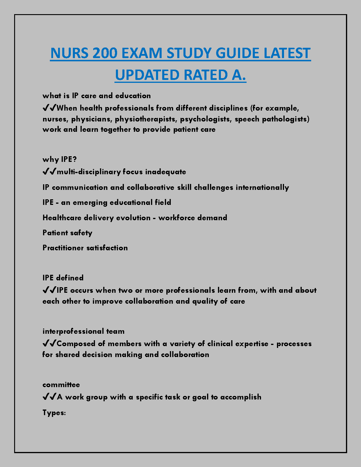 This comprehensive NURS 200 exam study guide is updated for the 2024/2025 academic year. Designed to help students master the key concepts and pass their exams with confidence on their first try, avoiding resits. The guide covers IP care and education, IPE, interprofessional teams, and more.